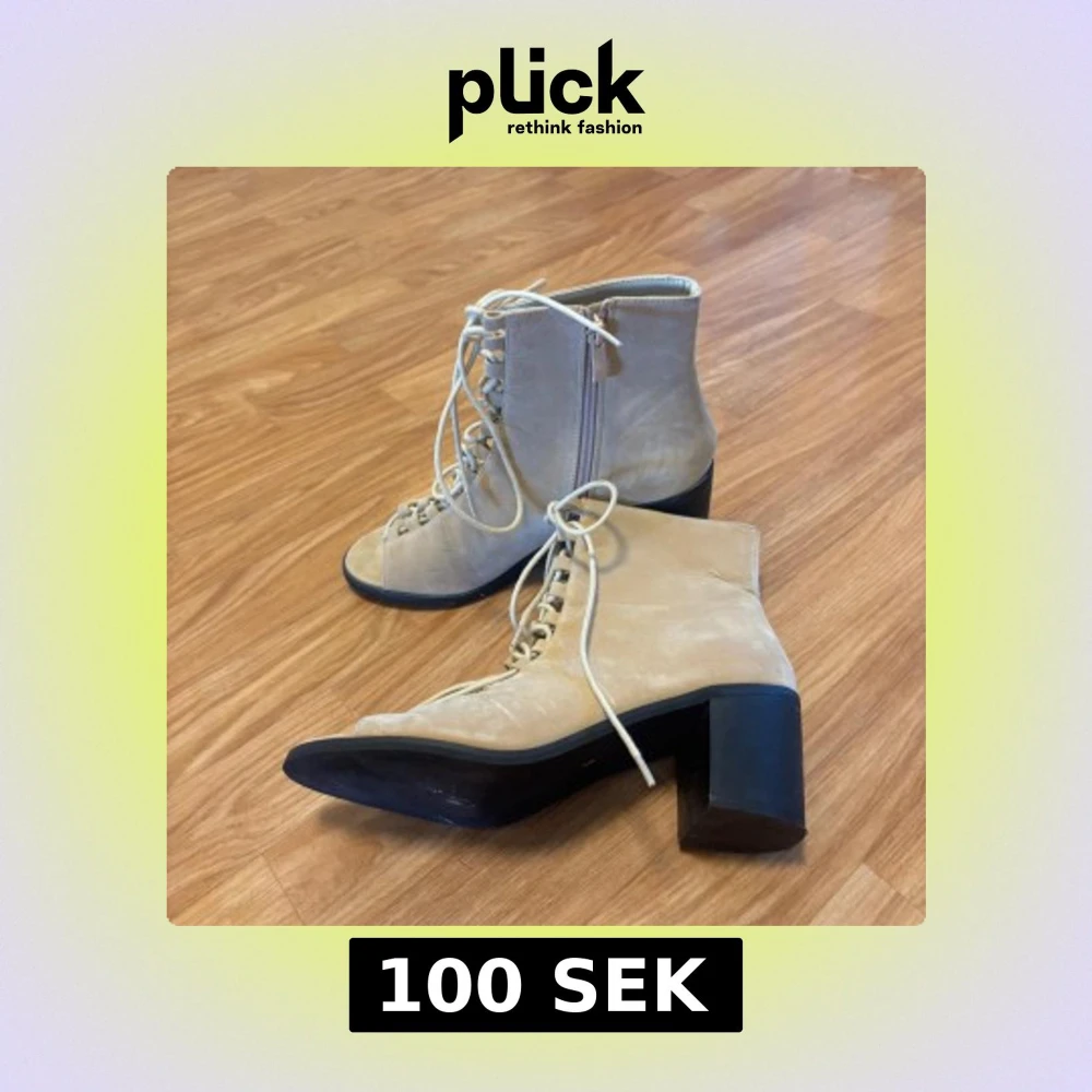 Snygga boots i beige mocka med kraftig klack och snörning framtill. Skorna har rund tå, dragkedja på sidan och platt sula. Perfekt för dig som gillar en cool och trendig look med lite höjd. Passar till både jeans och kjol.