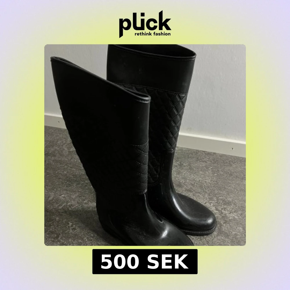 Säljer ett par svarta stövlar med quiltad detalj på skaftet. De har rund tå och är tillverkade i syntetmaterial med en glansig finish nedtill och matt quiltad ovandel. Perfekta för regniga dagar och ger en stilren look.