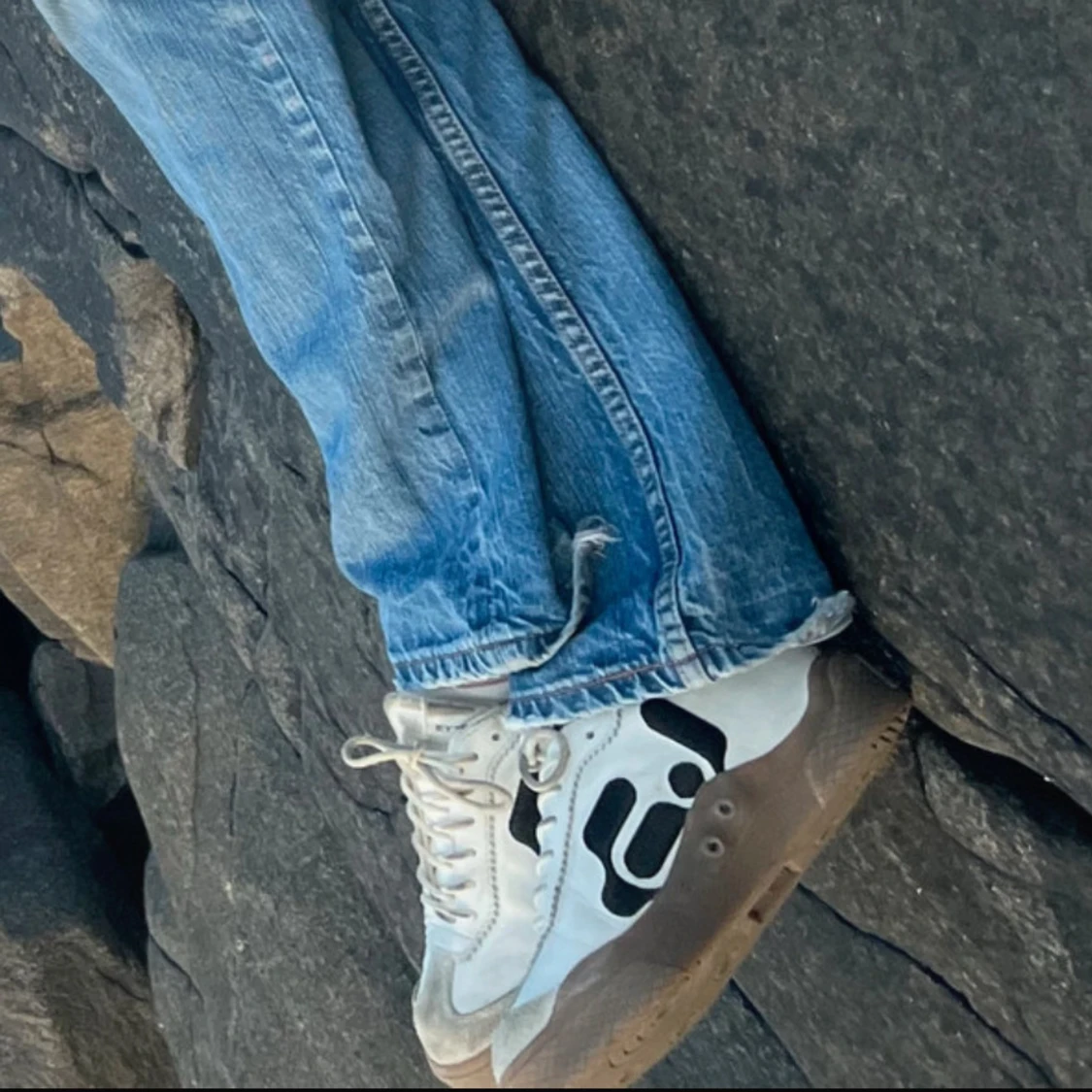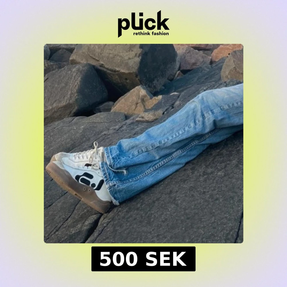 Säljer ett par vita sneakers med svart grafiskt mönster på sidan och brun sula. Skorna har snörning och en klassisk rund tå. Perfekta för dig som gillar en unik stil och vill sticka ut lite extra.