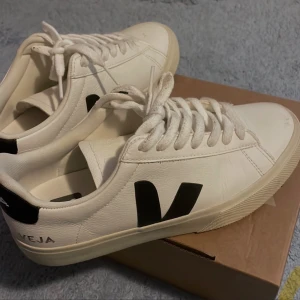 Snygga vita sneakers från Veja med svart logga på sidan och hälen. Skorna har klassisk snörning och är tillverkade i skinn. Perfekta för en stilren look.