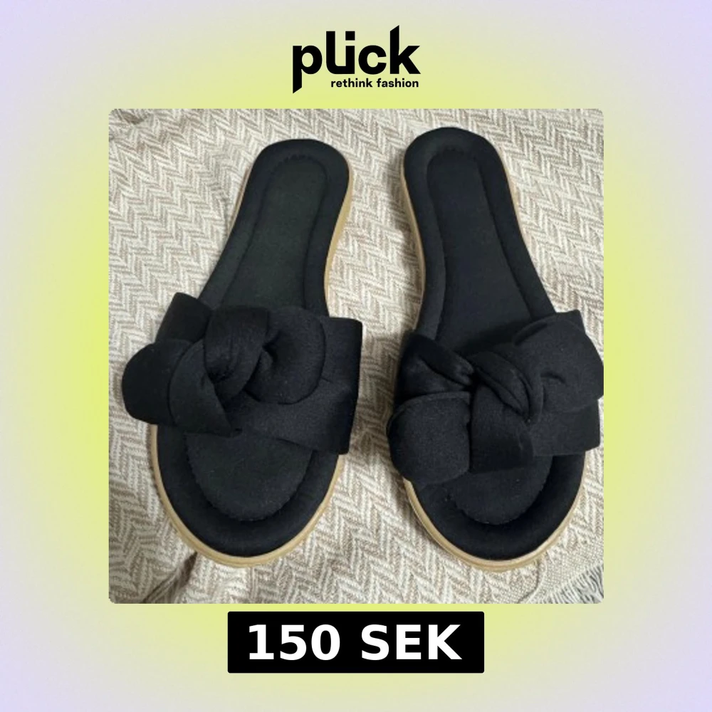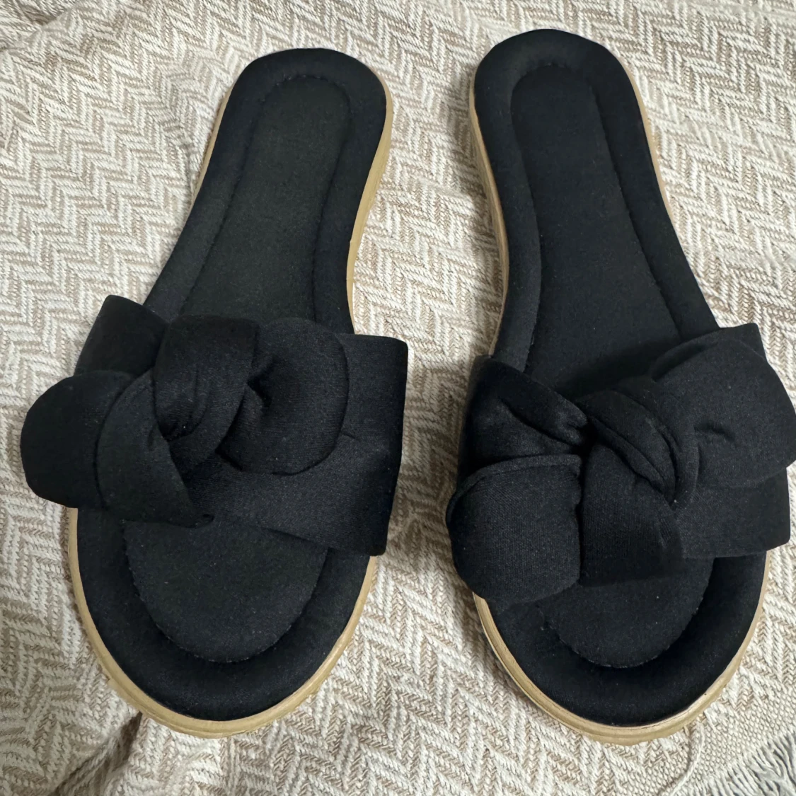 Stilrena svarta sandaler med breda band och stor rosett framtill. Skorna har platt sula i beige och ovandel i mjukt tygmaterial. Perfekta för varma dagar när du vill ha en enkel men snygg look. Använda en gång
