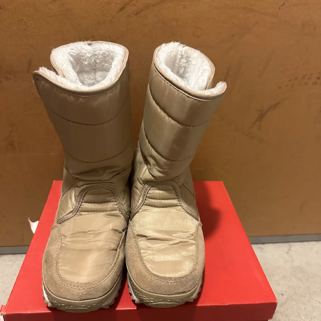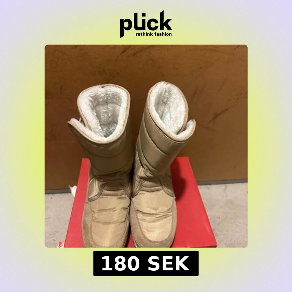 Säljer ett par beiga moon boots med mjukt vitt foder på insidan. Skorna har quiltad ovandel och platt sula, perfekta för kalla vinterdagar. Yttermaterialet är syntet och mocka, vilket ger både värme och stil. Passar dig som vill ha varma och bekväma skor under vintern.