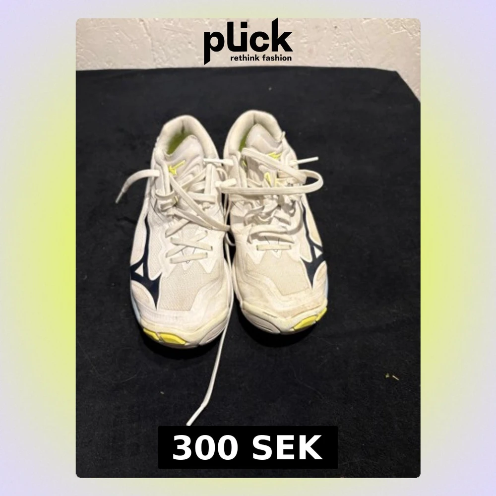 Säljer ett par vita Mizuno sneakers med mesh-överdel och snygga detaljer i mörkblått, gult och rött. Skorna har snörning, platt sula och rund tå. Perfekta för träning eller sport, med cool design och bekväm passform.