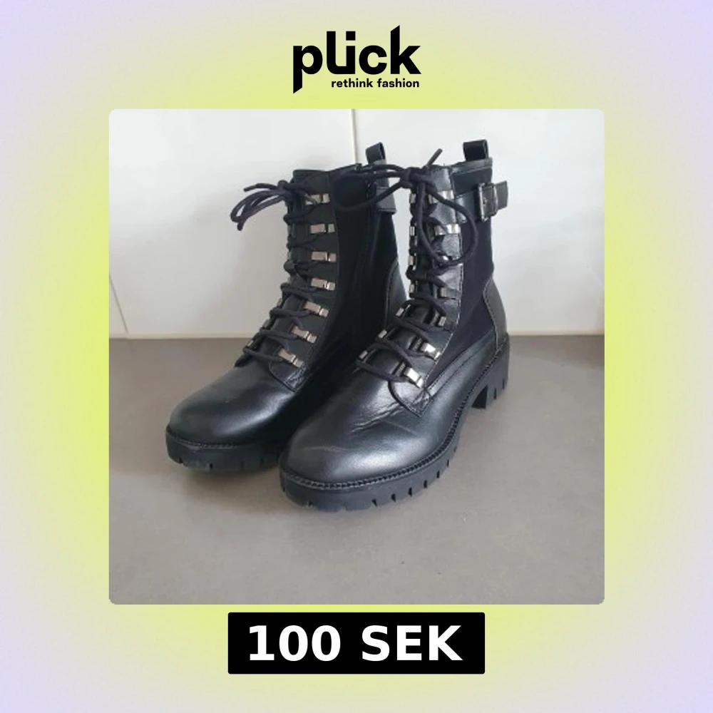 Tuffa svarta boots med grov sula, snörning framtill och coola metallhakar. Skorna har både skinn- och textildetaljer samt ett snyggt spänne vid ankeln. Perfekta för dig som vill ha en edgy stil med robust känsla. Använda 2 gånger, lite nötta fram annars mycket fint skick