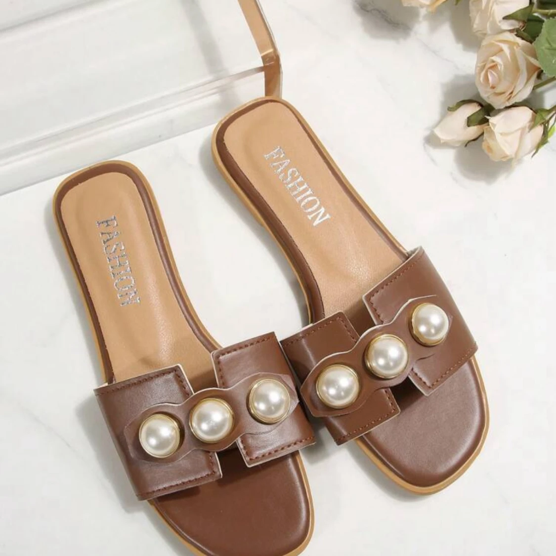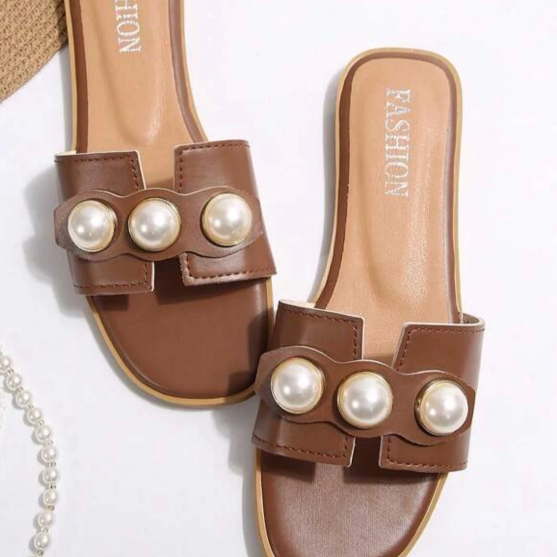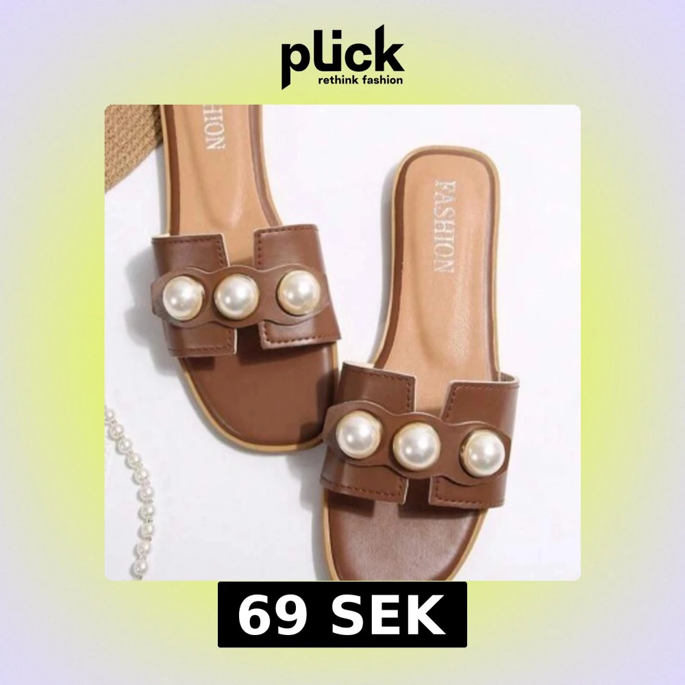 Snygga bruna sandaler i syntetmaterial med platt sula och öppen tå. Remmen är dekorerad med tre stora pärlor som ger en trendig och chic look. Perfekta att matcha med jeans eller klänning för en cool sommarstil. Säljer då dom var för små och de är bara använda 1 gång så de är i jätte bra skick.