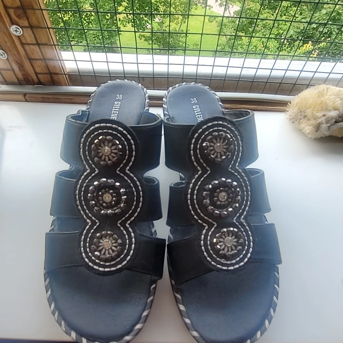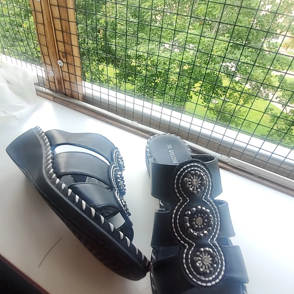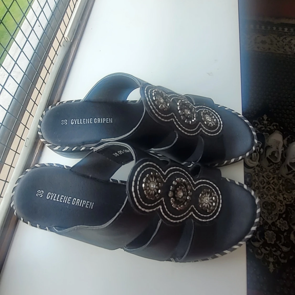 Svarta sandaler med breda remmar och dekorativa broderade detaljer samt pärlliknande dekorationer framtill. Snygg kontrastsöm runt sulan och platt sula för skön känsla. Perfekta för dig som vill ha något unikt och bekvämt till sommaren.