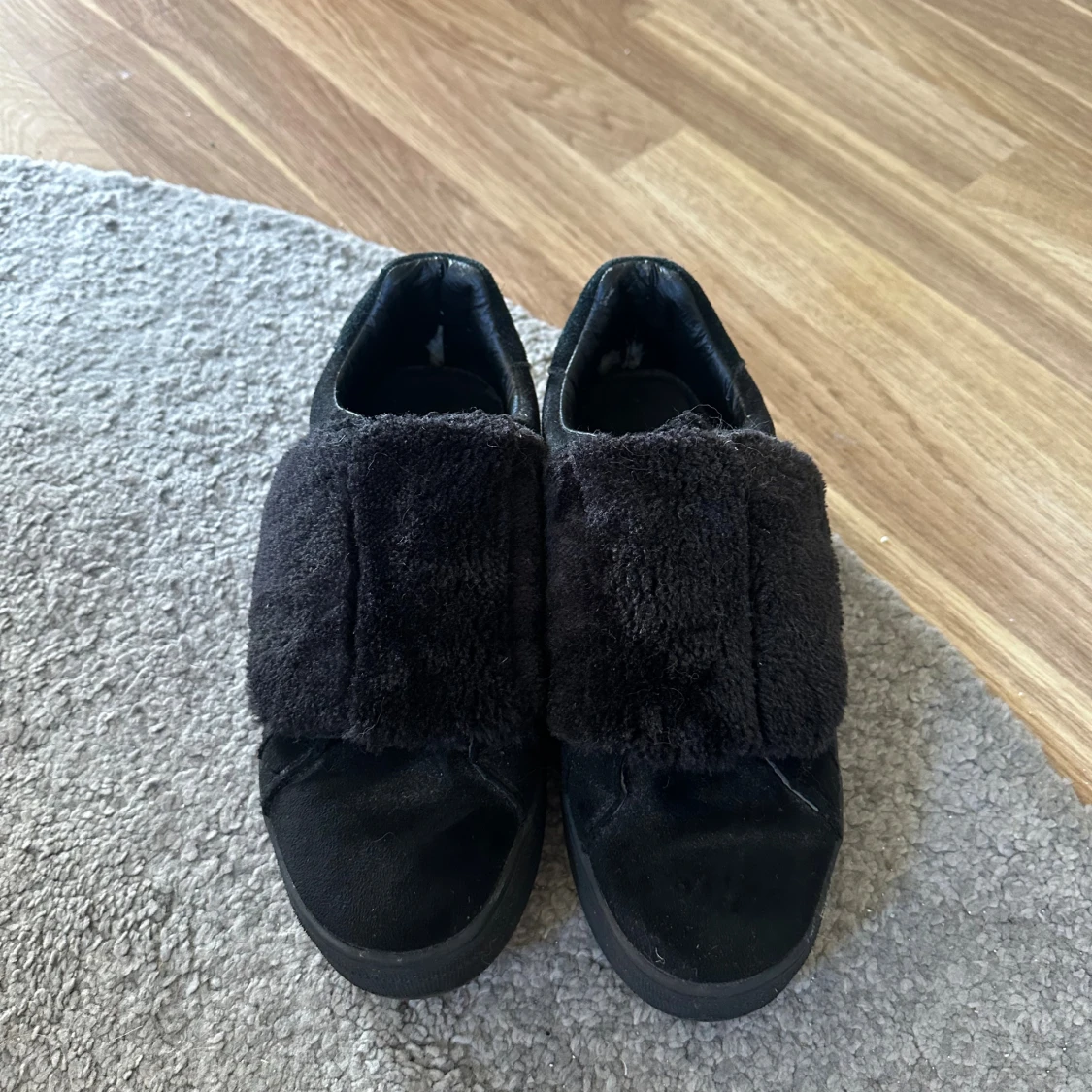 Unika svarta sneakers från ICHI med breda band i mjuk fuskpäls över foten som är kardborreband så man behöver inte hålla på o knyta😍haft dom ett tag men på sista bilden ser dom helt gråa ut och det är dom inte fortfarande svarta och fina! Storlek 38!