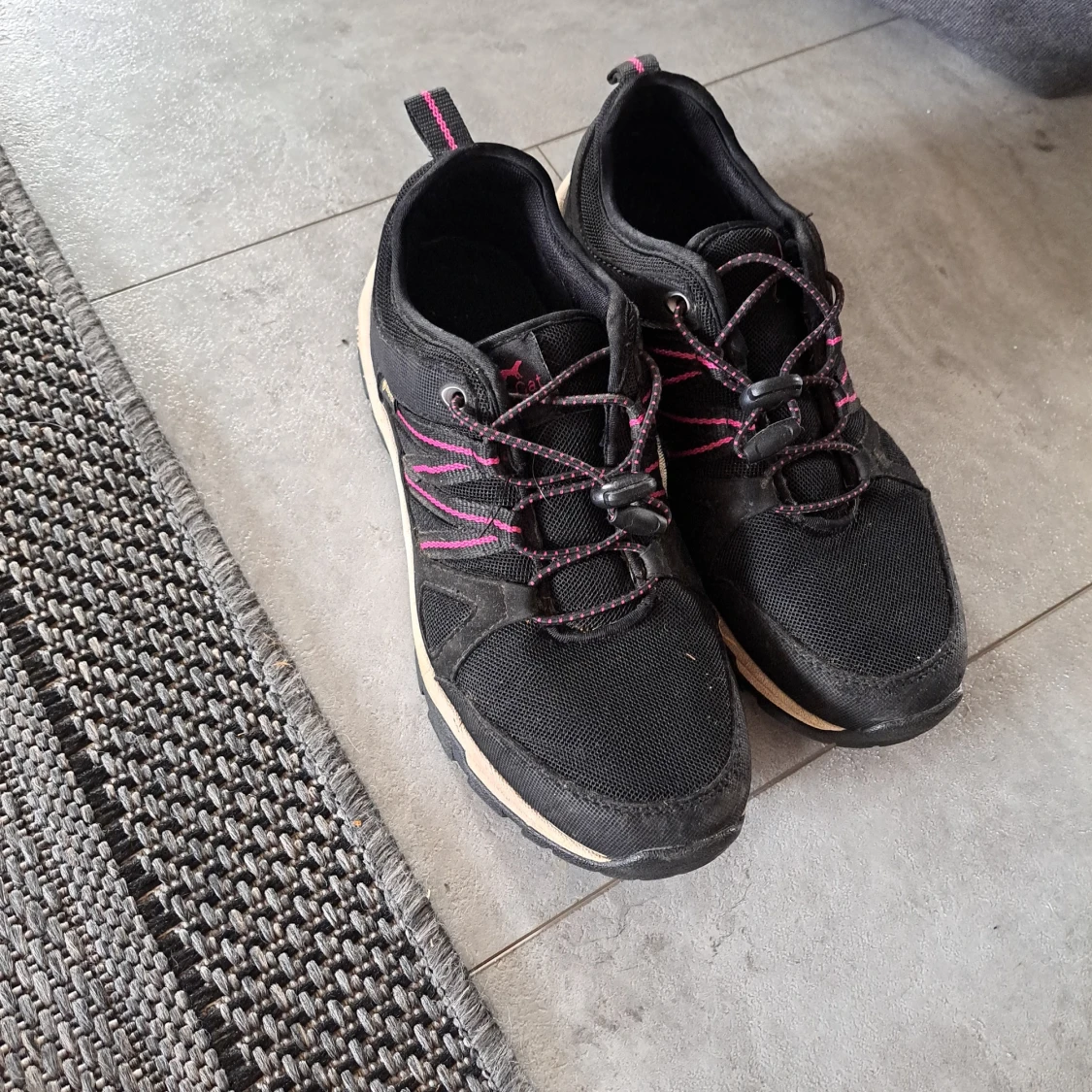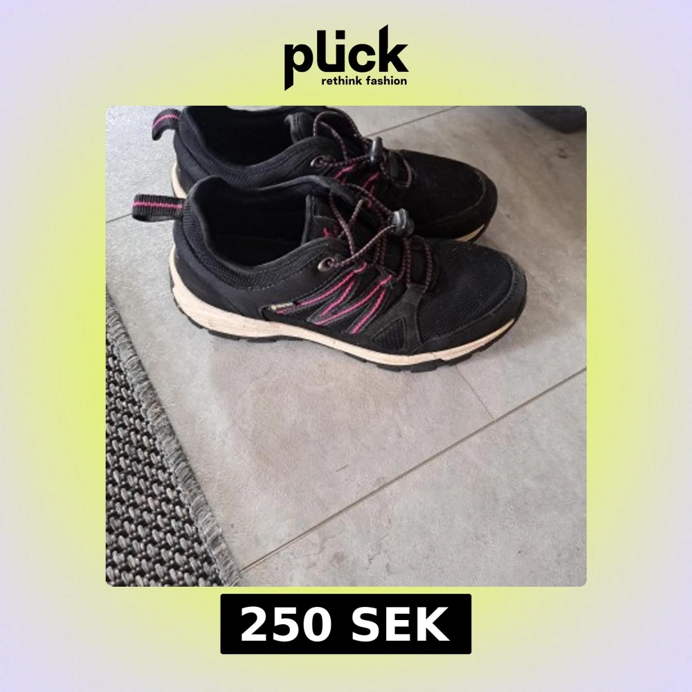 Svarta sneakers med rosa detaljer och snörning med snabbspänne. Ovandel i slitstark textil och syntet, sula i beige och svart. Perfekta för dig som gillar en sportig och bekväm stil. Vattenavvisande material från Gore-Tex. 25,6cm inuti