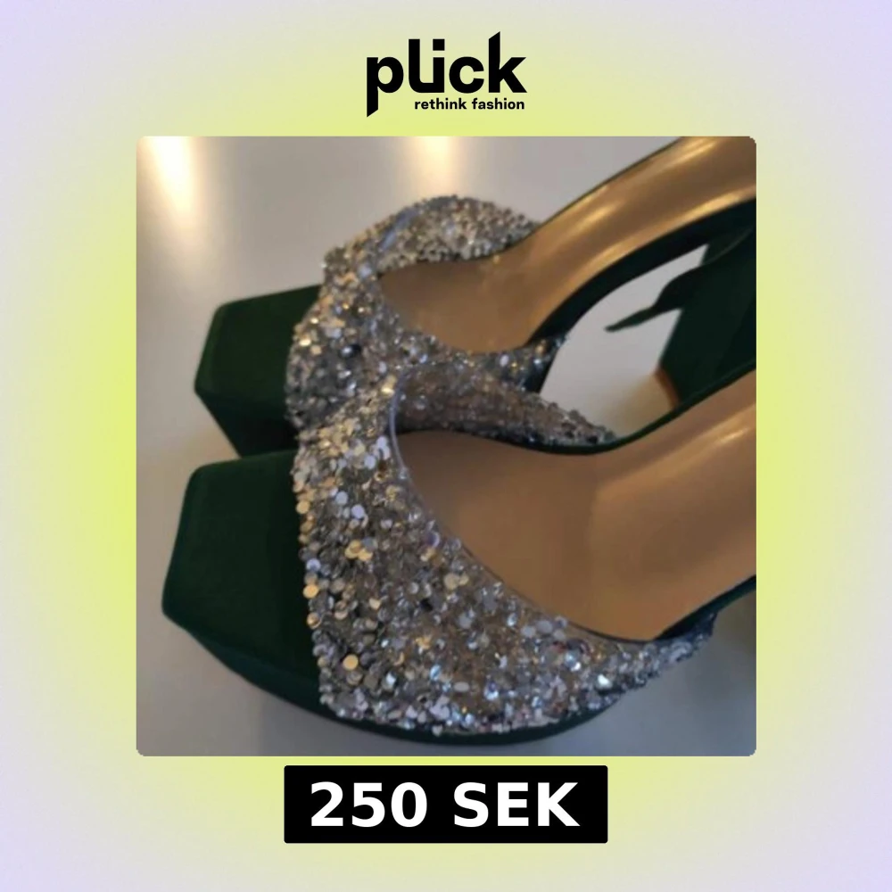 Snygga gröna klackskor i satin med glittriga paljettdetaljer. Skorna har en hög blockklack och en justerbar rem runt ankeln för extra stöd. Perfekta för att ge en glamorös touch till din outfit.