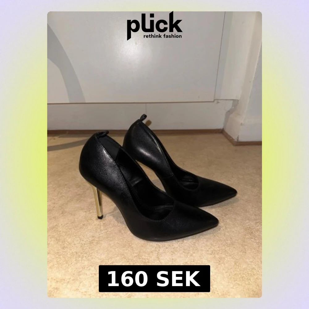 Säljer ett par stilrena svarta pumps i syntet med spetsig tå och höga guldfärgade klackar. Skorna har en elegant form och passar perfekt till dig som vill ha en klassisk men ändå modern look. Supersnygga till både jeans och klänning. size written is 40 but its 39