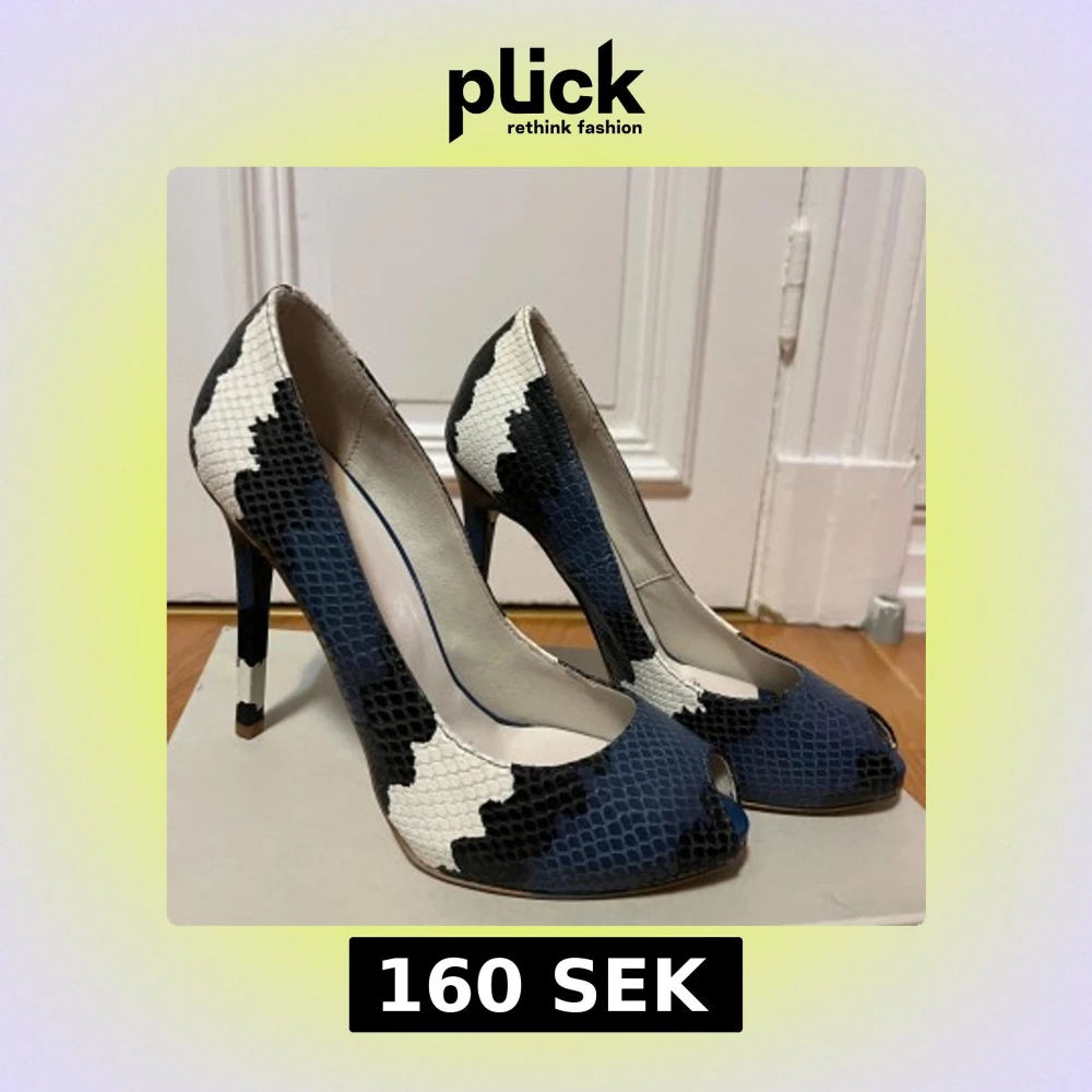 Säljer ett par snygga pumps med hög klack och öppen tå från Mai piu sesenza Skorna har ett blått, svart och vitt ormskinnsmönster som ger en cool look.