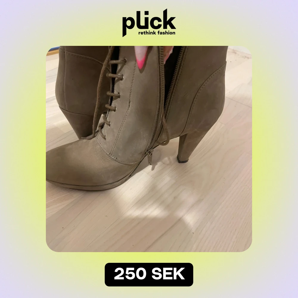 Snygga beige boots med klack och snörning. De har en dragkedja på sidan för enkel på- och avtagning. Perfekta för en stilren look.