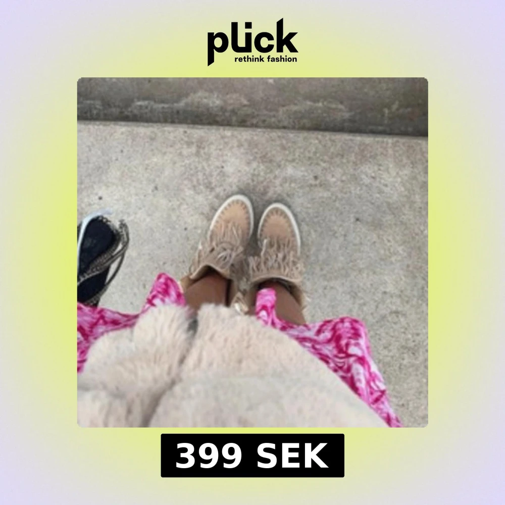 Unika sneakers i beige mocka med coola fransdetaljer och snörning framtill. Skorna har en platt vit sula och grova stickade sömmar längs kanterna. Perfekta för dig som vill sticka ut med en boho-inspirerad stil.