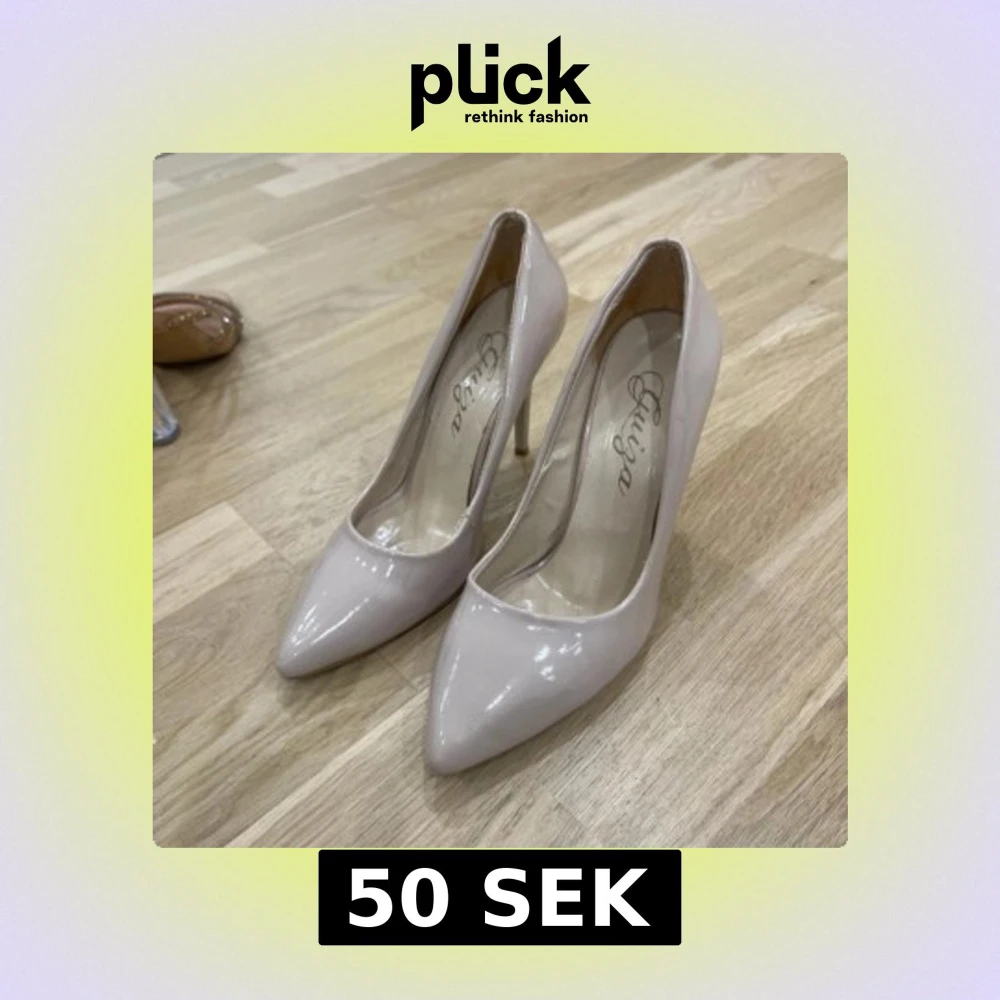 Säljer ett par eleganta beige pumps med spetsig tå och hög klack. De är i ett glansigt material som ger en lyxig känsla. Perfekta för fest eller andra speciella tillfällen!