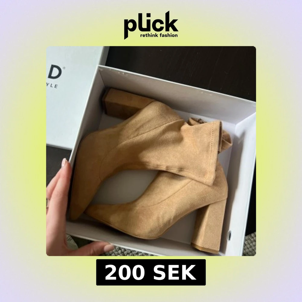 Säljer ett par snygga beiga boots i mocka med hög klack och spetsig tå. Skorna har dragkedja på insidan och en stilren design som passar perfekt till höst- och våroutfits. Helt nya!