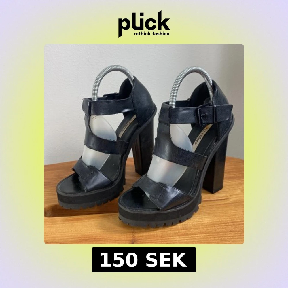 Säljer ett par svarta chunky klackskor från N.L.Y Shoes med breda remmar och spänne vid ankeln. Skorna har hög klack och plattformssula för extra höjd och attityd. Perfekta för dig som vill sticka ut med en edgy look. Knappt använda.