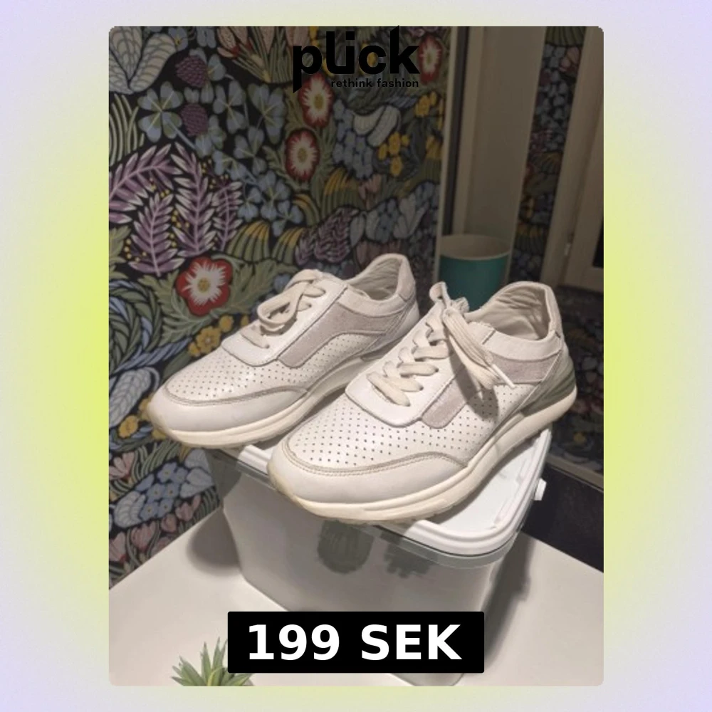 Säljer ett par vita sneakers från Goodin Comfort med perforerat skinn och detaljer i ljus mocka. Skorna har snörning, rund tå och platt sula. Snygga och stilrena med silverfärgad häl och textdetalj på sidan. Perfekta för dig som gillar cleana sneakers.