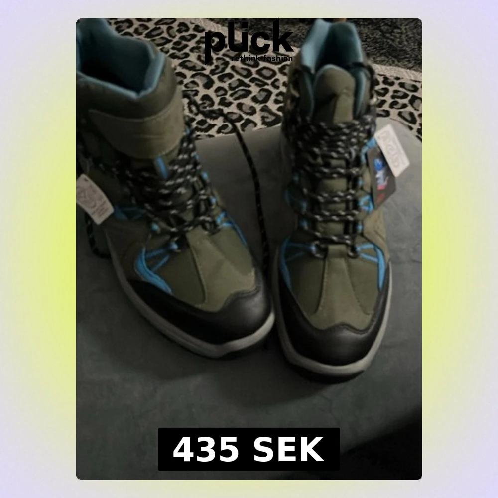 Säljer ett par gröna kängor från Crivit med svarta och blå detaljer. Skorna har grov sula för bra grepp, snörning och blått innerfoder. Materialmix av syntet och textil, perfekta för utomhusaktiviteter. Snygg outdoor-look med coola kontrastdetaljer.