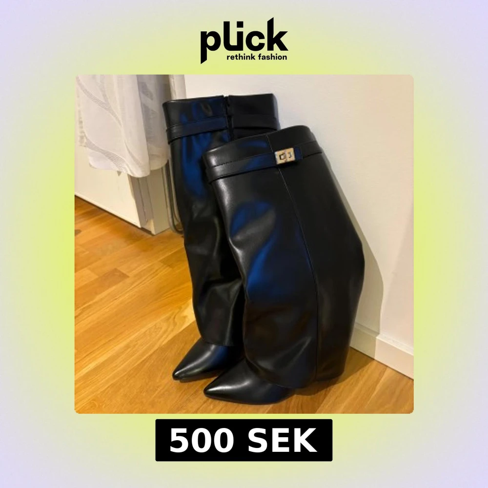 Snygga svarta stövlar i skinnimitation med spetsig tå och dekorativt guldfärgat spänne upptill. Stövlarna har en hög och slouchy passform som ger en cool siluett. Perfekta att styla med både kjol och jeans för en trendig look. Aldrig använda. Stl 39 men passar 38