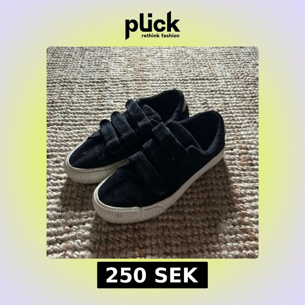 Svarta sneakers med breda kardborreband och vit sula. Skorna är gjorda i manchestertyg som ger en cool textur och retrovibe. Perfekta för dig som vill ha något unikt och bekvämt till vardags. Rund tå och platt sula för en avslappnad look.