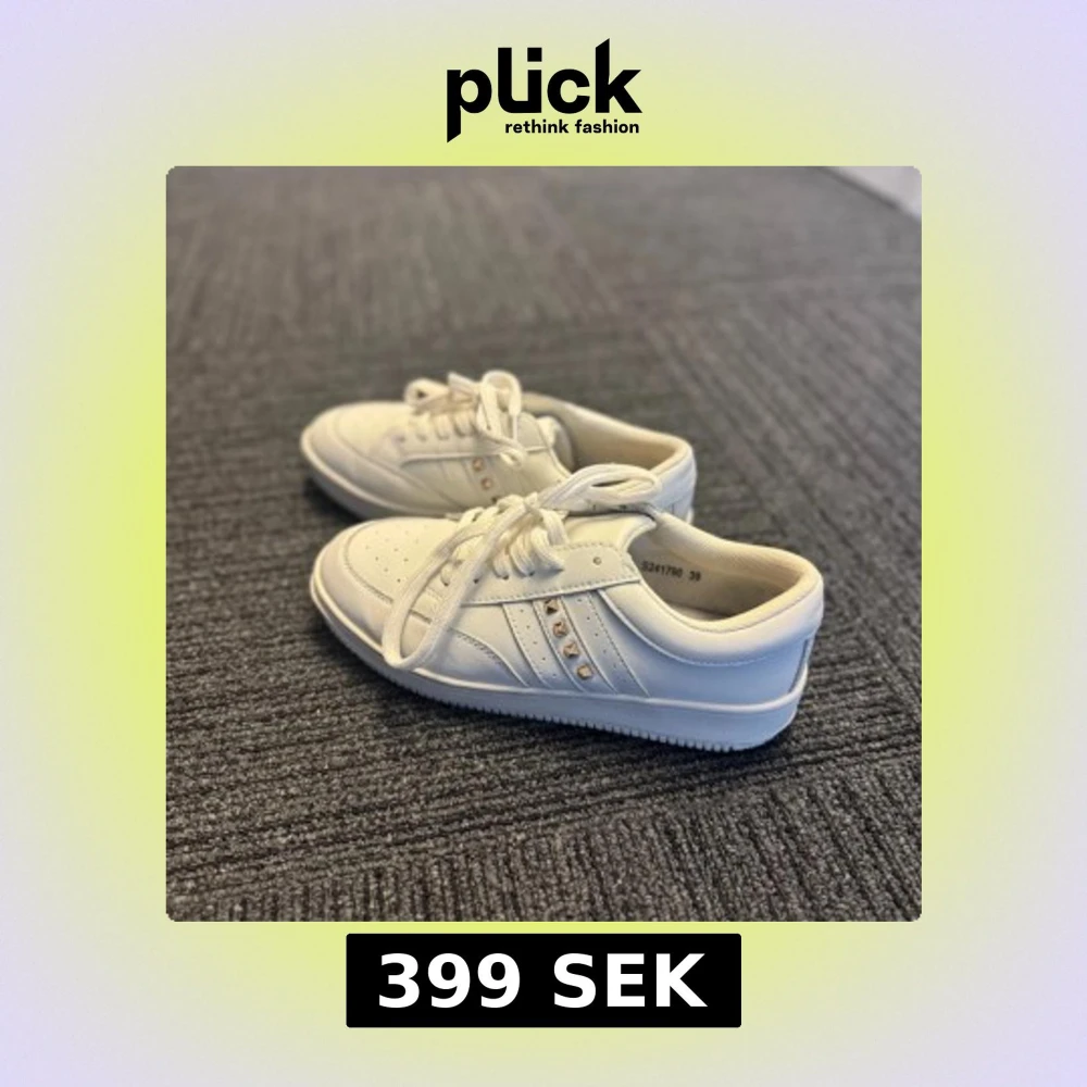 Snygga vita sneakers från Sofie Schnoor i skinnimitation med klassisk rund tå och snörning. Sidan pryds av dekorativa små nitar för en cool detalj. Perfekta för dig som gillar stilrena men ändå unika skor. Använda ett fåtal gånger.