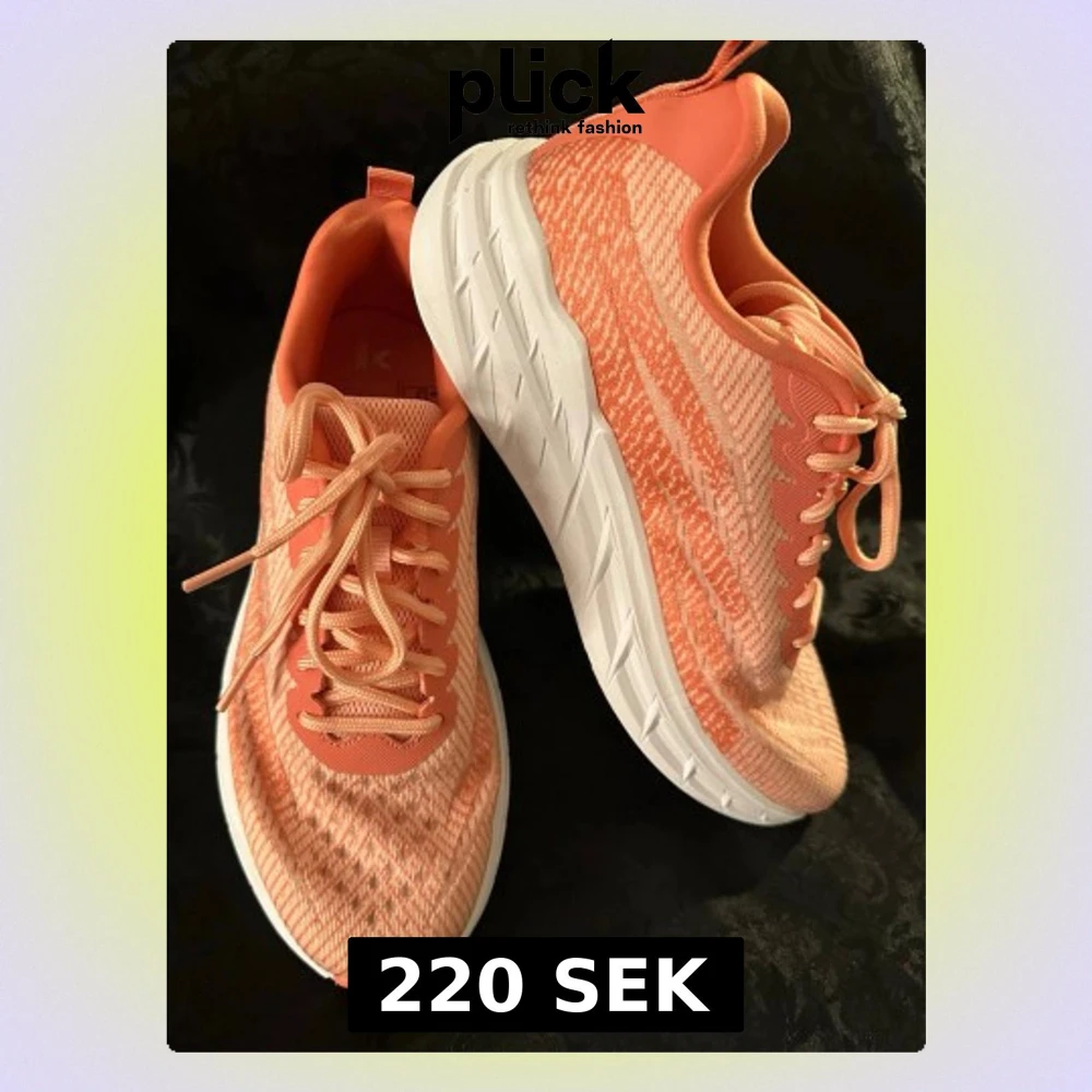 Snygga sneakers i korall och ljusorange med stickat mönster och vit, tjock sula. Skorna har rund tå, snörning och ventilerande meshmaterial. Perfekta för dig som gillar sportig stil och vill ha något som sticker ut med fräscha färger.