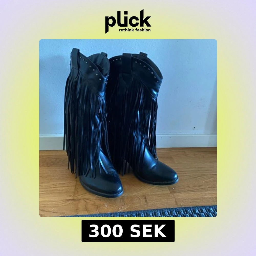 Snygga svarta boots med långa fransar och nitar upptill. Perfekta för en cool och unik stil. De har en spetsig tå och är tillverkade i syntetmaterial. Aldrig använda.