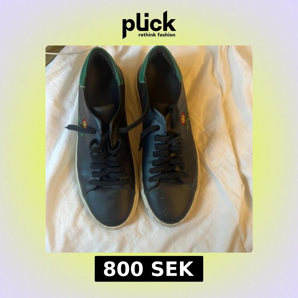 Svarta sneakers från Axel Arigato med vit sula och gröna detaljer vid hälen. Sidan pryds av en broderad glad blomma i rött, gult och grönt. Skorna har svarta skosnören och är tillverkade i skinn. Perfekta för dig som vill ha en unik och lekfull touch på dina sneakers.