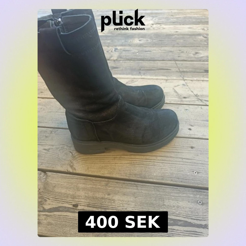Säljer ett par svarta boots i skinn med grov platt sula och rund tå. De har dragkedja på sidan för enkel på- och avtagning. Perfekta för dig som gillar en stilren och robust look. Passar till både jeans och kjol.