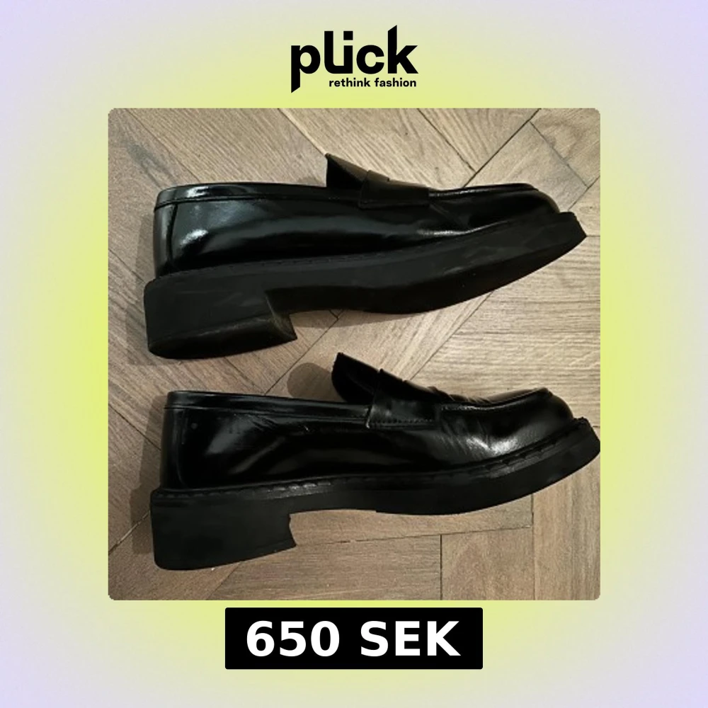 Säljer ett par klassiska svarta loafers i modellen Naeli från Pavement. Skorna har en stilren design med rund tå och platt sula, tillverkade i blankt skinn. Perfekta för dig som gillar en tidlös och clean look.