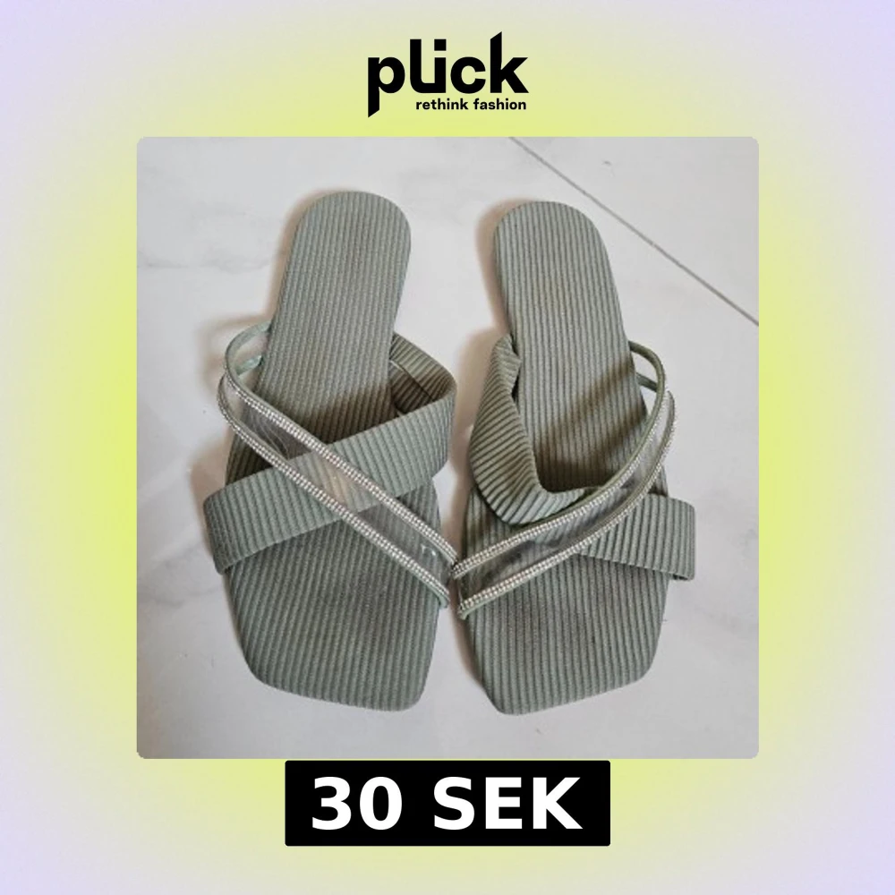 Snygga sandaler i ljusgrönt ribbat tyg med fyrkantig tå och transparenta band dekorerade med små glittriga stenar. Perfekta för sommarens alla tillfällen och ger en trendig touch till din outfit.