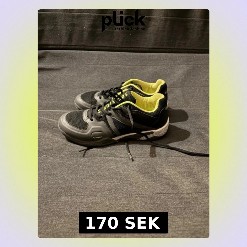 Säljer ett par svarta sneakers från SOC med neongul insida och detaljer. Skorna har snörning, meshpartier för ventilation och en vit sula med grå inslag. Perfekta för dig som gillar sportig stil och vill sticka ut lite extra.