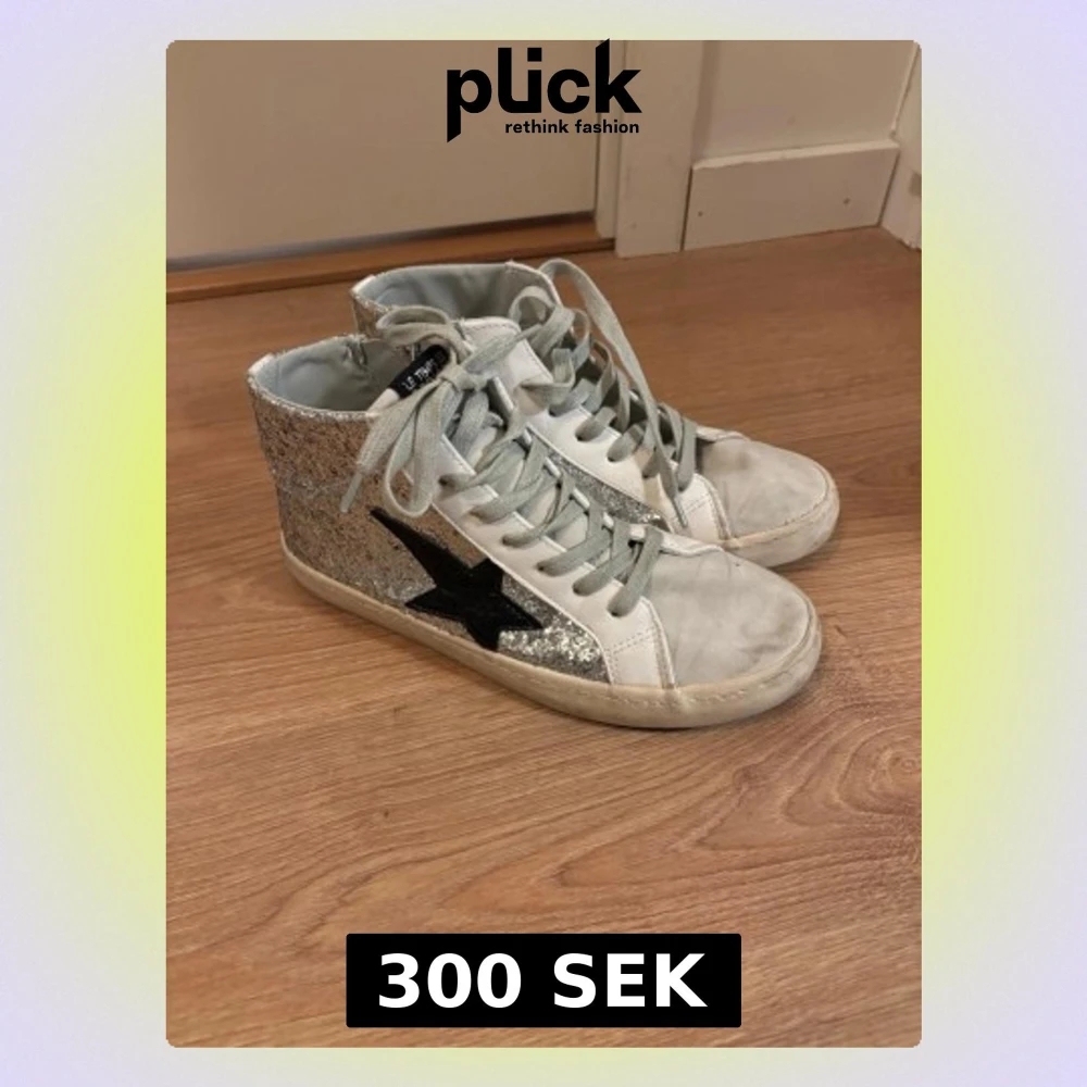 Säljer ett par vita high top sneakers från Le Temps des Cerises med silverglittriga sidor och en svart stjärna på utsidan. Dom är sparsamt använda och har lite smuts längs fram som går att tvätta bort!