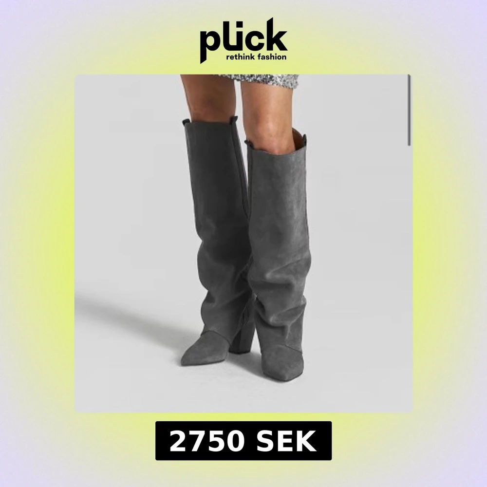 Snygga höga stövlar i grå mocka med spetsig tå och bred klack. Stövlarna har en slouchy passform och en markerad söm längs utsidan. Perfekta att styla till kjol eller jeans för en trendig look. Kartongen finns kvar och tillkommer. Kan mötas upp i Stockholm eller skicka
