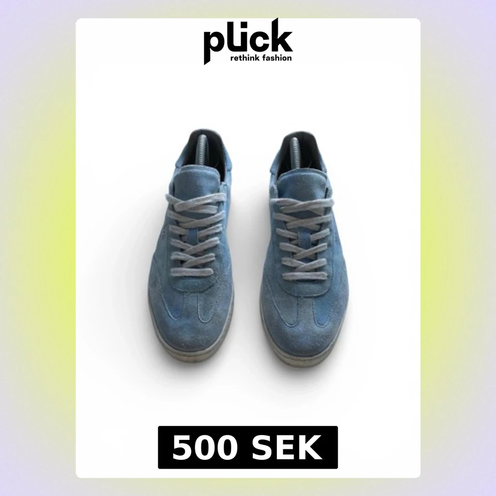 Säljer ett par ljusblå sneakers från All Saints i mjuk mocka med vita snören och platt sula. Skorna har en rund tå och diskret guldfärgad logga på sidan. Perfekt för dig som gillar stilrena och fräscha sneakers med snygg retrovibe.