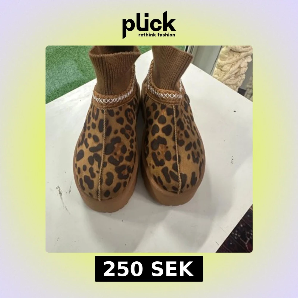 Jag säljer 4 par Unika boots med leopardmönster i bruna toner och ribbad stickad kant upptill. Skorna har en rejäl platåsula i gummi och rund tå. Materialet är mockaliknande med detaljer i textil och syntet. Perfekta för dig som vill sticka ut med din stil.