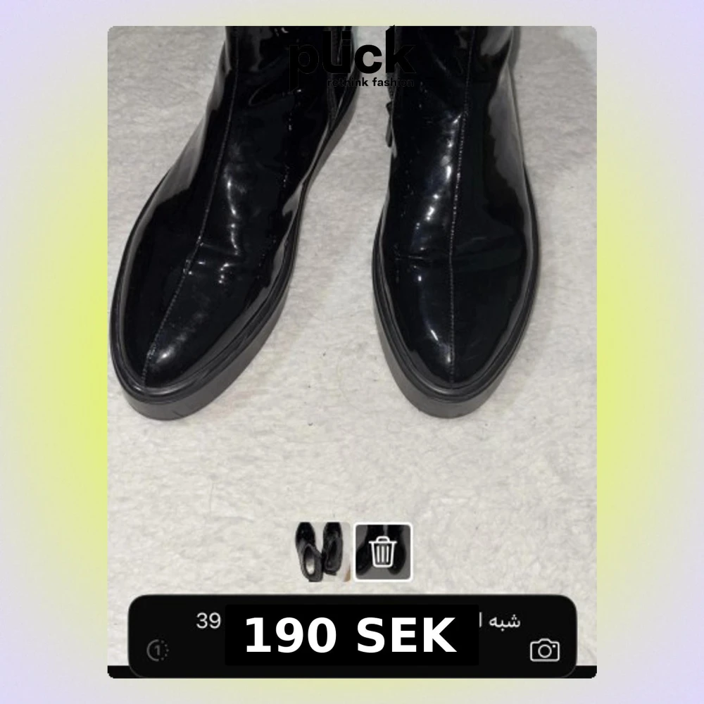 Säljer ett par svarta, glansiga stövletter från Anny Nord i storlek 39. Skorna har dragkedja på sidan, spetsig tå och platt sula. Tillverkade i syntetmaterial med en stilren look som passar till många outfits.