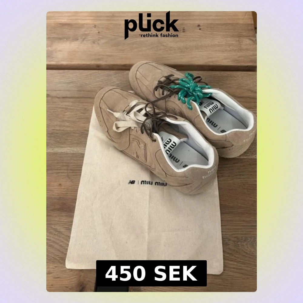 Unika beige sneakers i mocka med en lyxig och trendig känsla. Skorna har olika färg på skosnörena, ett par är bruna, ett par vita och ett par gröna, vilket ger en subtil men lekfull detalj. Klassisk sportinspirerad sula och en diskret logga på sidan. Insidan är vit och helhetsintrycket är stilrent, modernt och genomarbetat.
