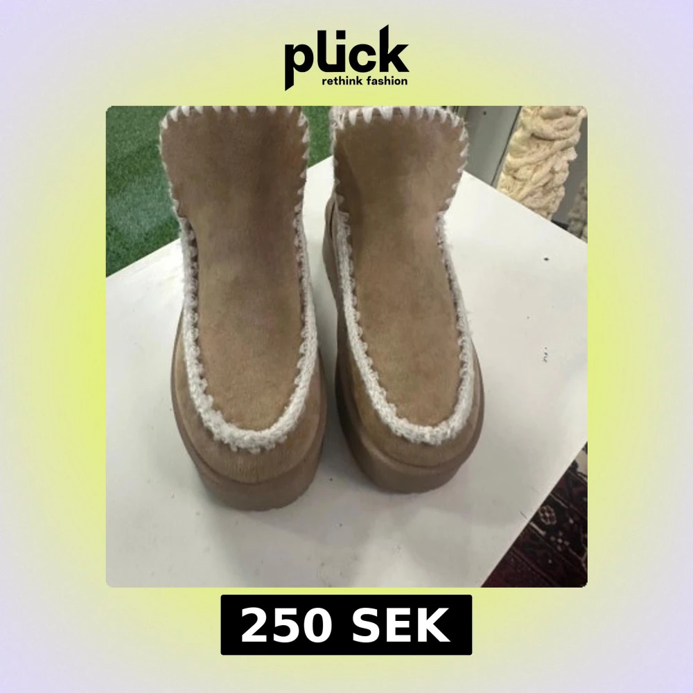 Mysiga beige boots med tjock sula och vitt fårskinnsfoder. Skorna har dekorativa vita sömmar längs kanten och är tillverkade i mocka. Perfekta för kalla dagar när du vill hålla värmen och ändå se snygg ut.
