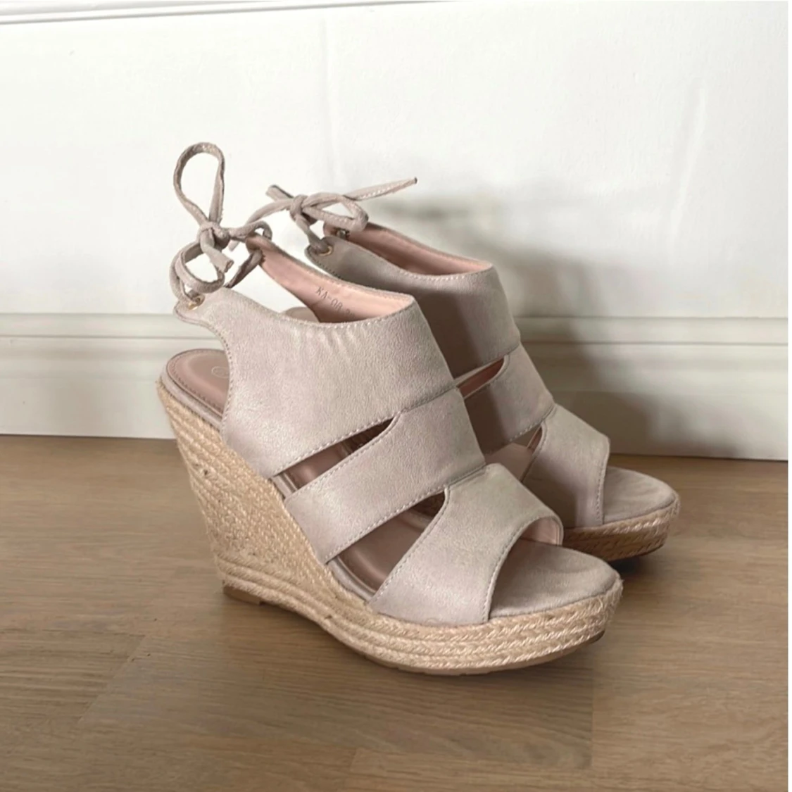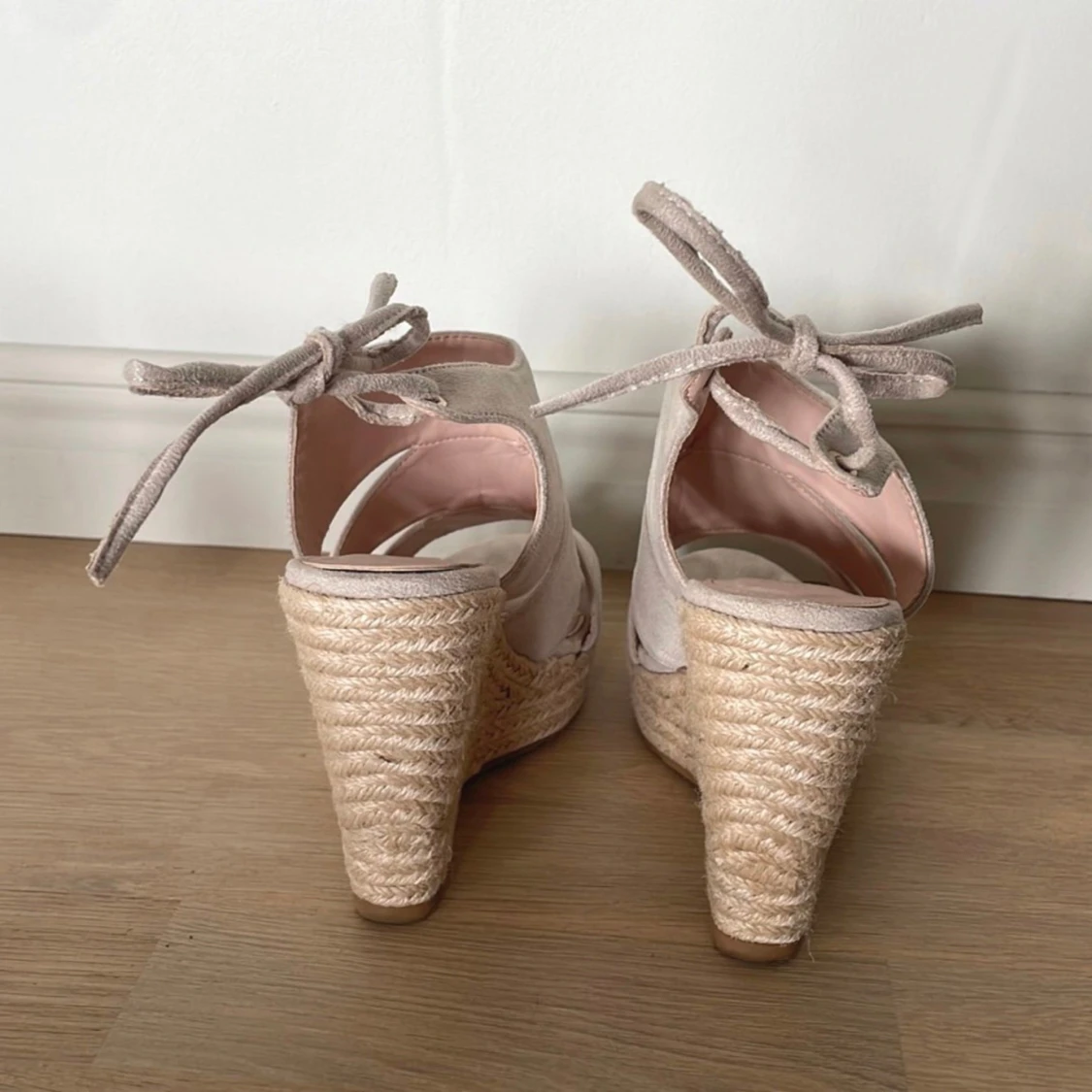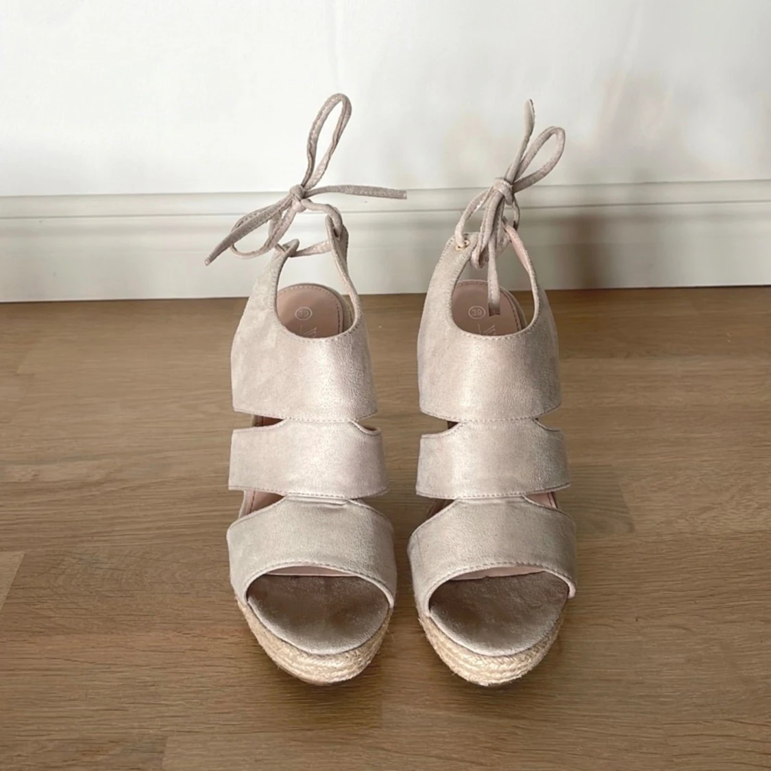 Snygga och sköna kilklackar i beige mocka med snörning runt vristen. Perfekt skick! (Använda en gång) Storlek 39