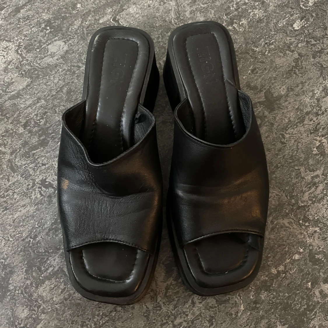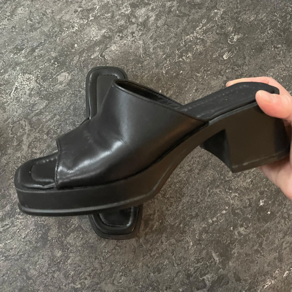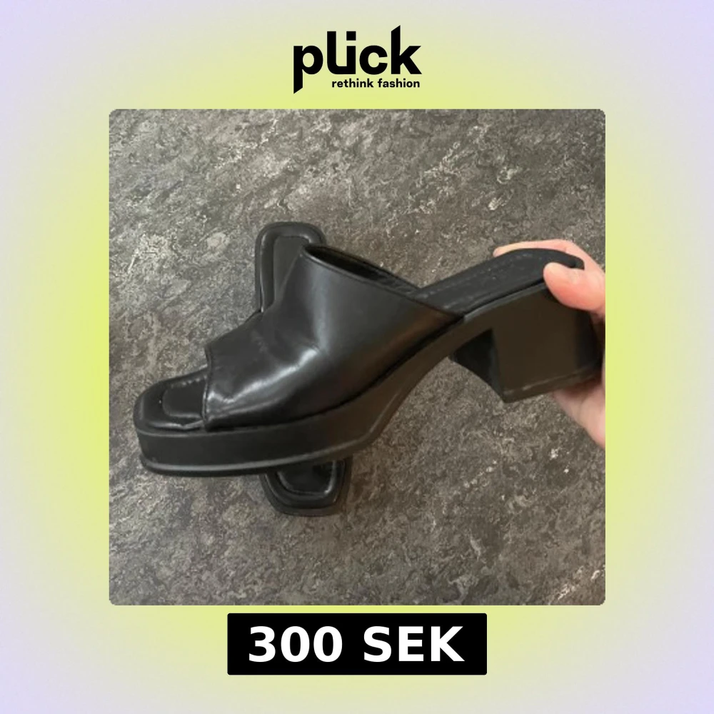 Snygga svarta klackskor i skinn med öppen tå och fyrkantig sula.