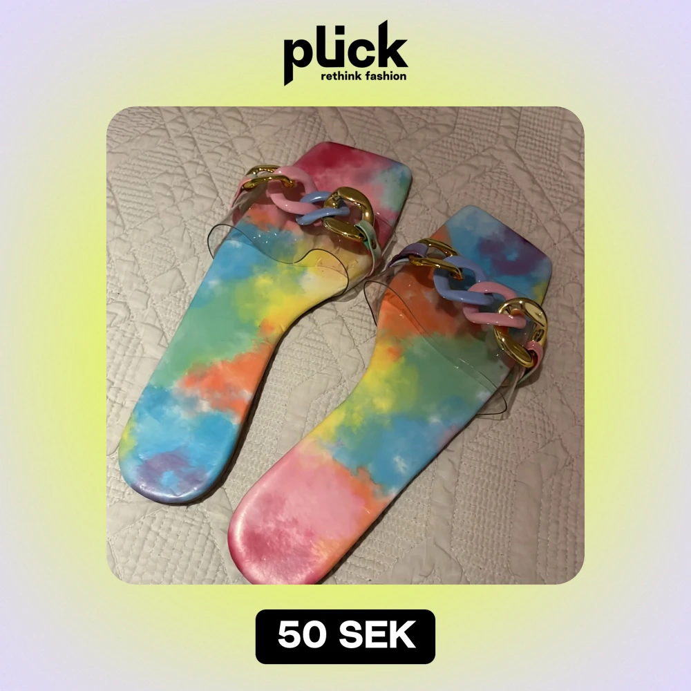 Supercoola sandaler i regnbågens alla färger! De har en transparent rem med en stor, färgglad kedja som detalj. Perfekta för sommaren när du vill sticka ut lite extra. De är platta och bekväma, så du kan ha dem på dig hela dagen. Passar perfekt till en avslappnad sommarlook eller en dag på stranden.