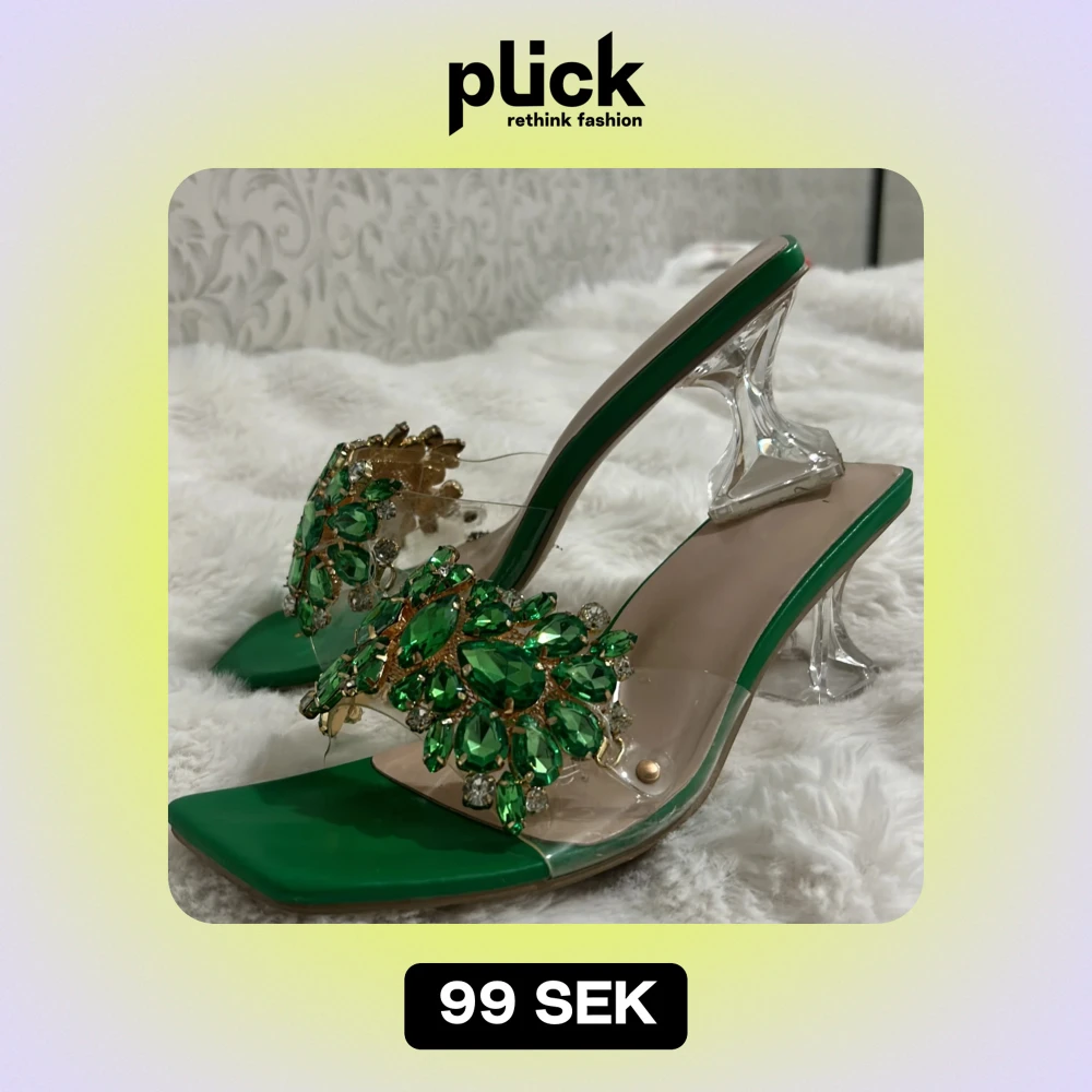 Snygga gröna klackskor med transparent klack och glittriga strassdetaljer framtill. Perfekta för en festlig kväll eller bal. De har en fyrkantig tå och en unik design som verkligen sticker ut. Klacken är i en cool transparent stil som ger en modern touch.
