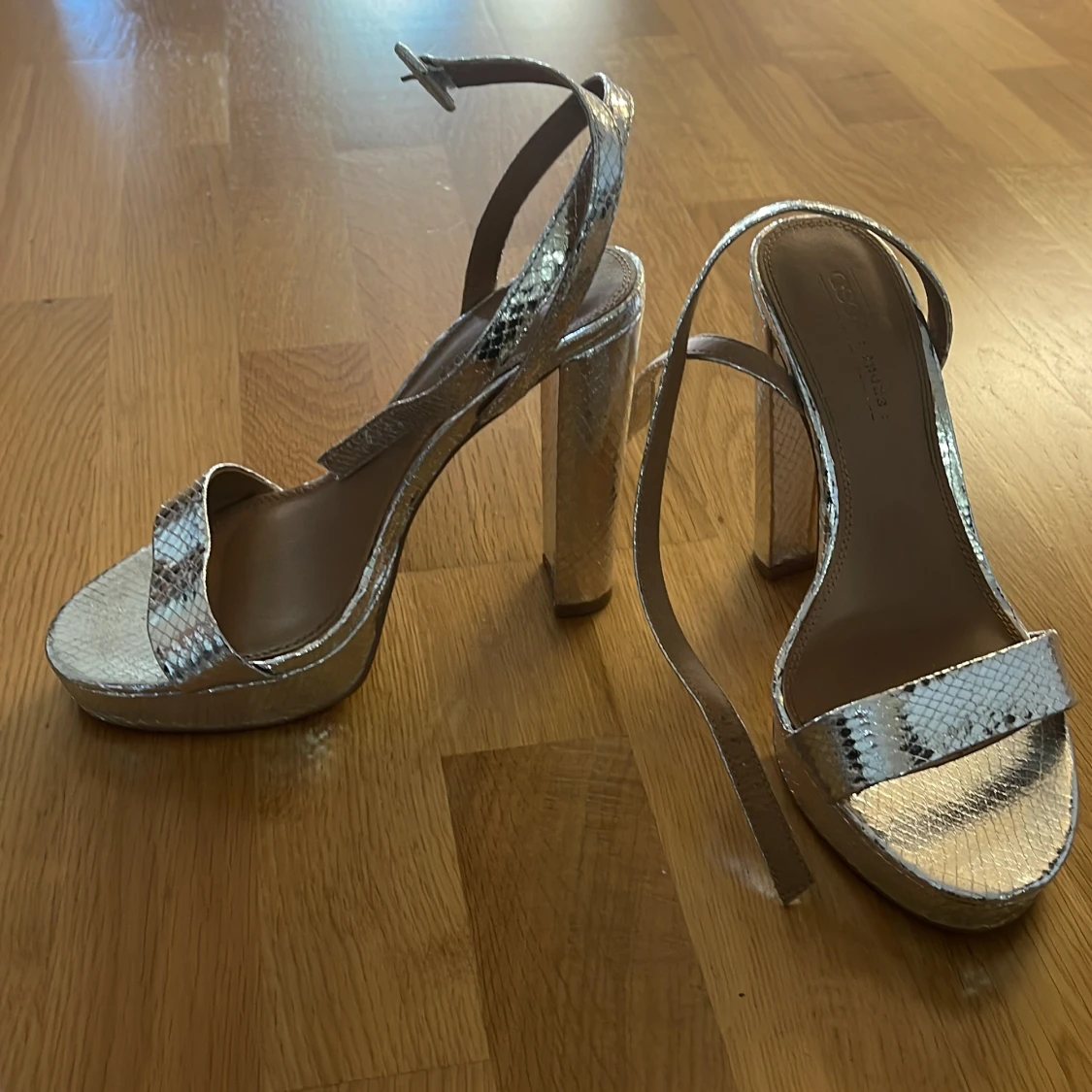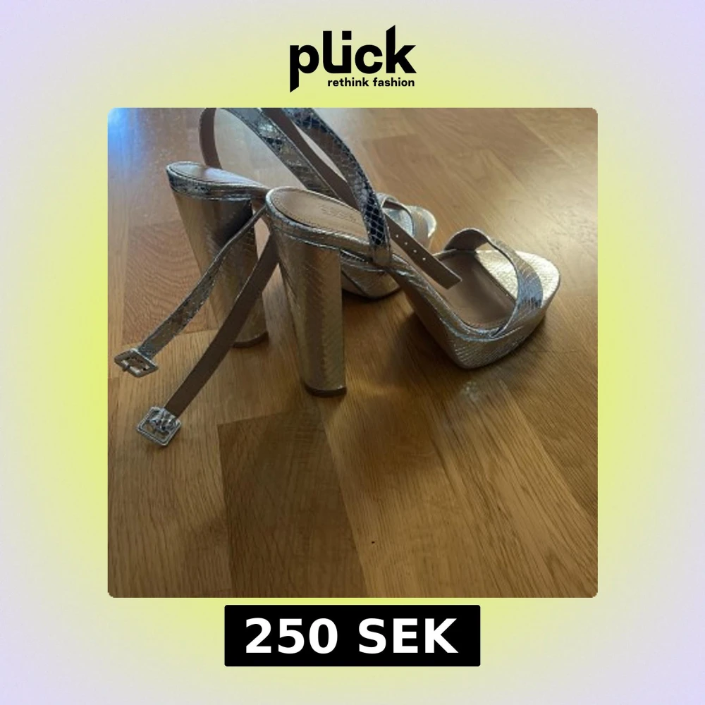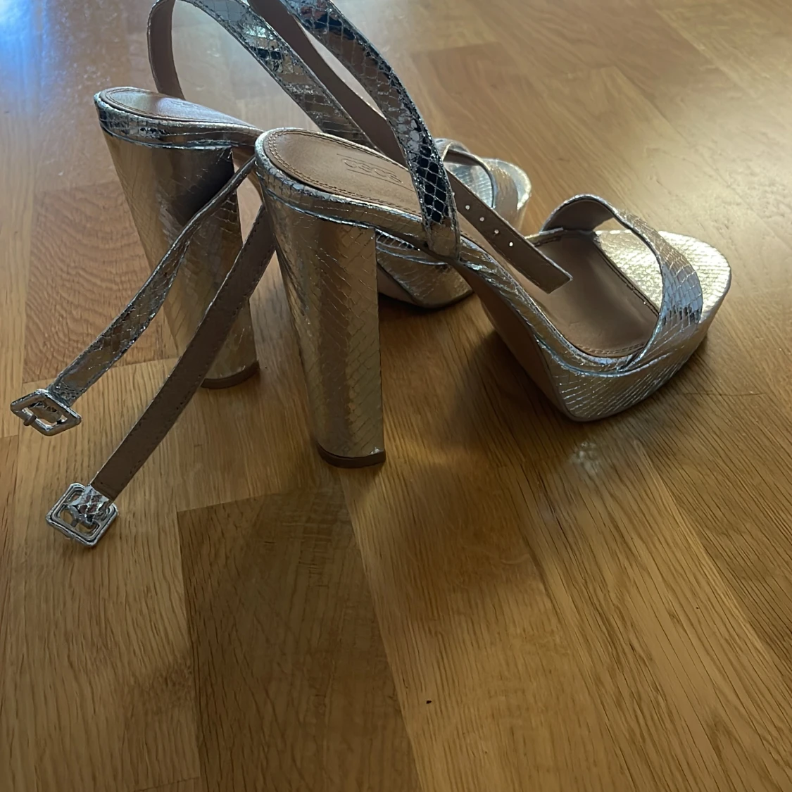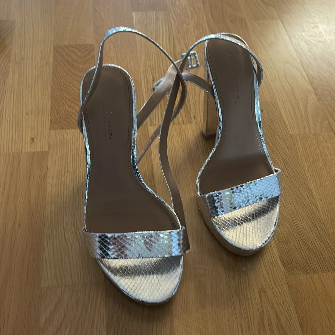 Snygga sandaler i metallic silver med ormskinnsmönster och bred platåsula. Skorna har hög blockklack, öppen tå och smala remmar med spänne runt vristen. Perfekta för att sticka ut och ge extra höjd till din outfit.