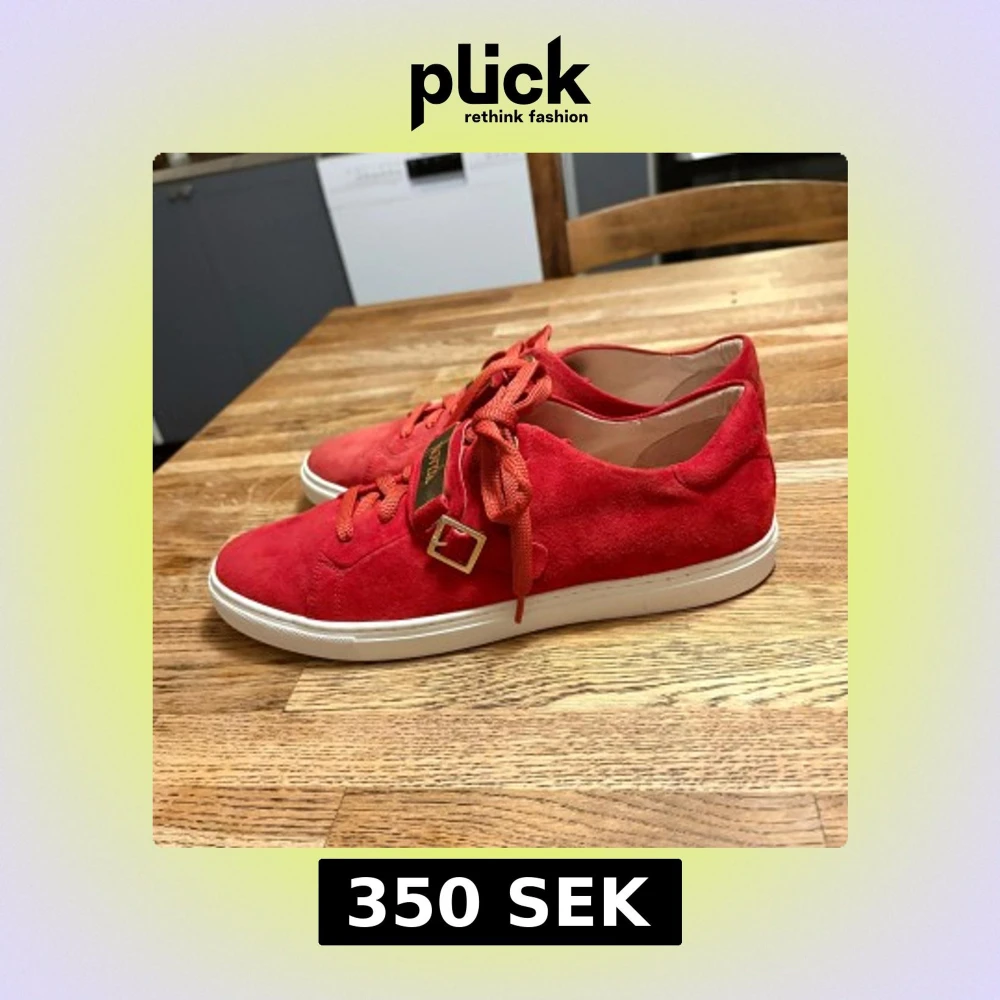 Snygga röda sneakers från Novita i mjuk mocka med vita sulor. Skorna har röda snören, guldfärgade detaljer och spänne samt en metallbricka med Novita-logga. Perfekt för dig som vill sticka ut med färg och stil. Nypris 1400kr.