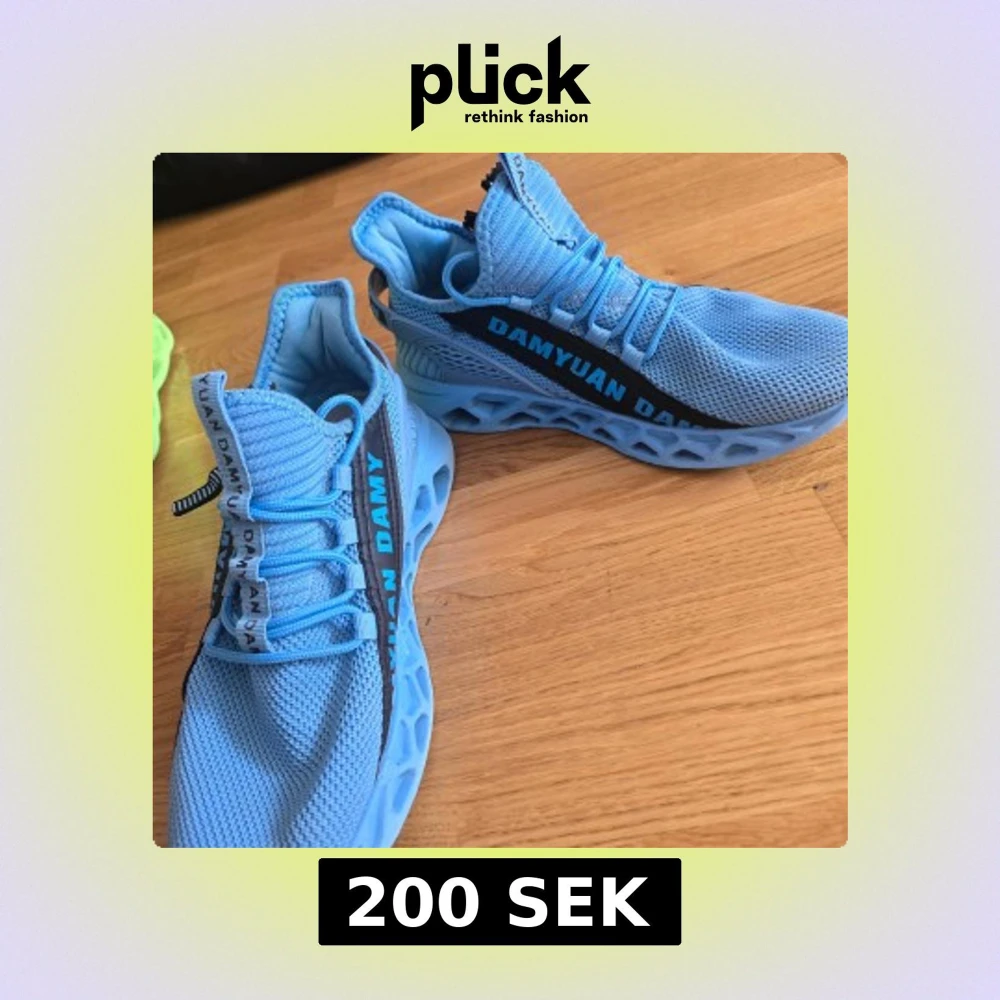 Säljer ett par fräscha blå sneakers från Damyuan med svart detalj och text på sidan. Skorna har snörning och en luftig mesh-ovandel samt en cool, mönstrad sula. Perfekta för dig som vill sticka ut med färg på fötterna!