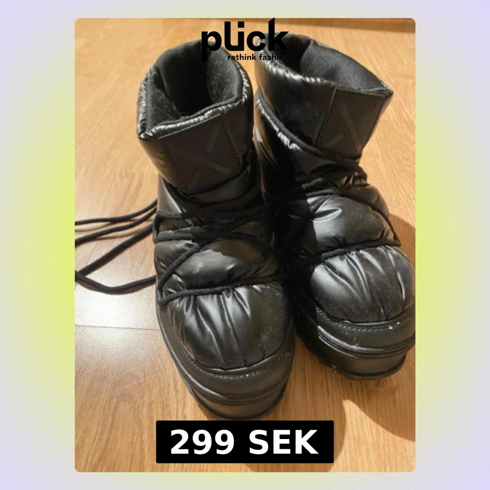 Säljer ett par svarta moon boots från Exani i storlek 40. Skorna har snörning och är tillverkade i syntetmaterial med vadderad och quiltad yta. Perfekta för kalla vinterdagar och har en rund tå samt platt sula för extra komfort.
