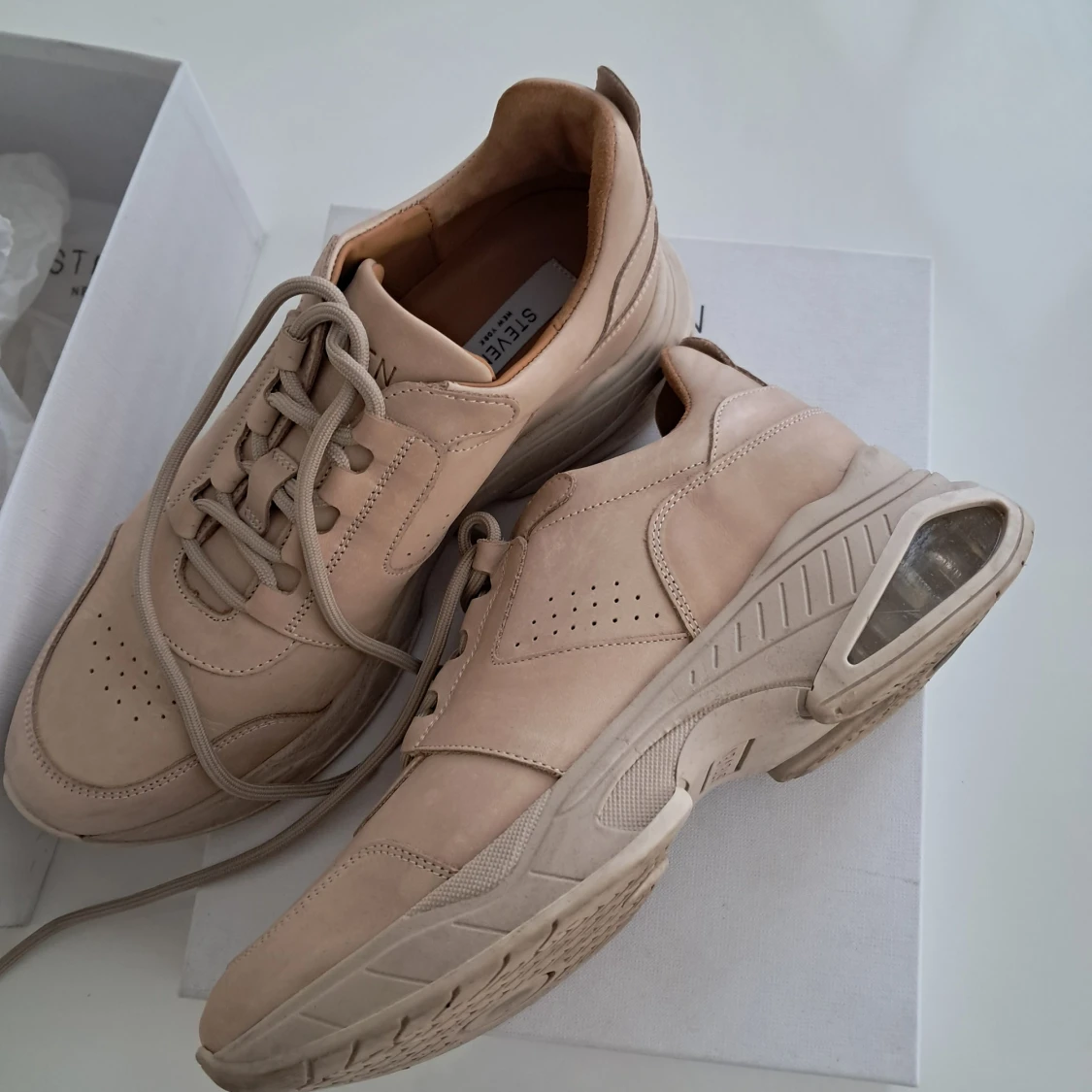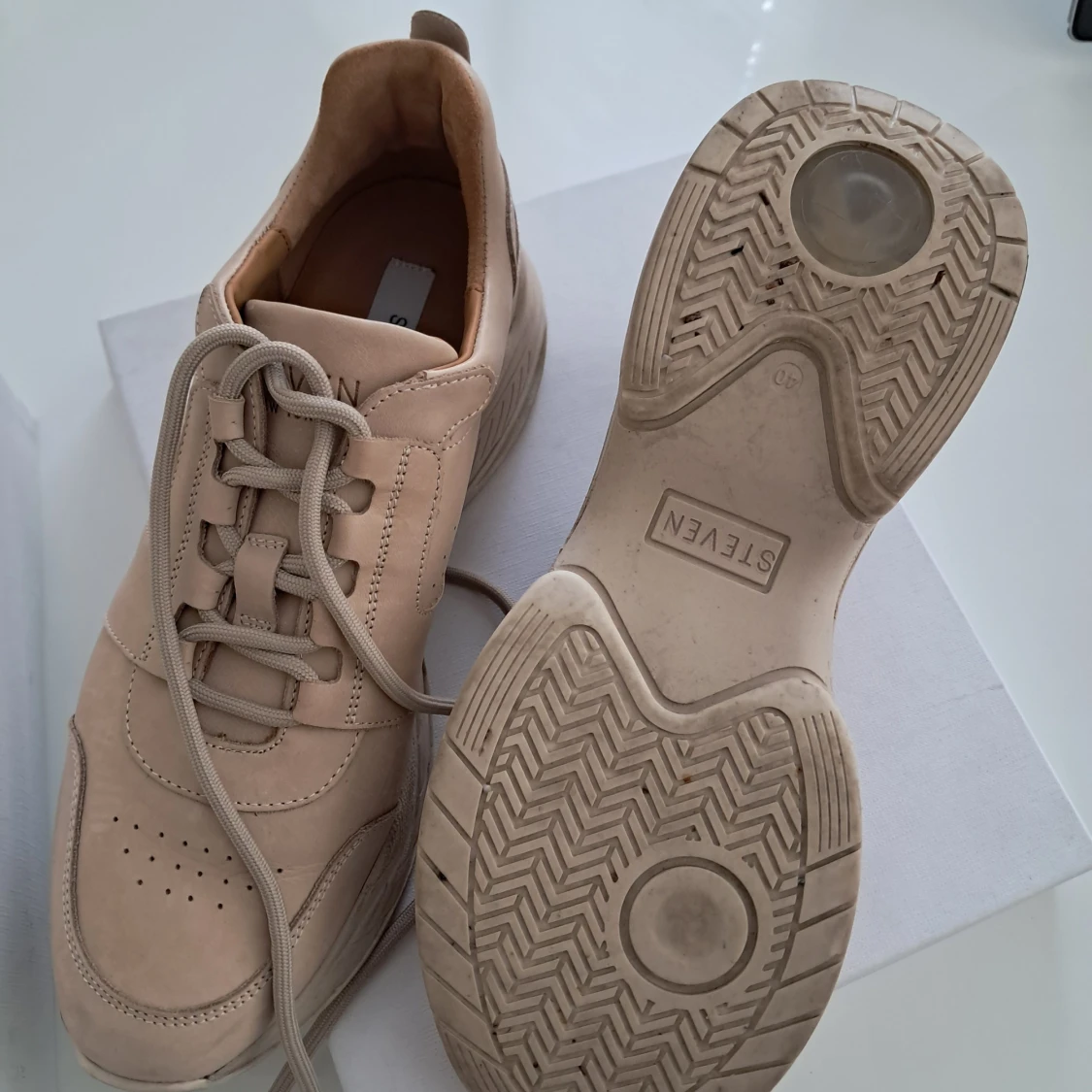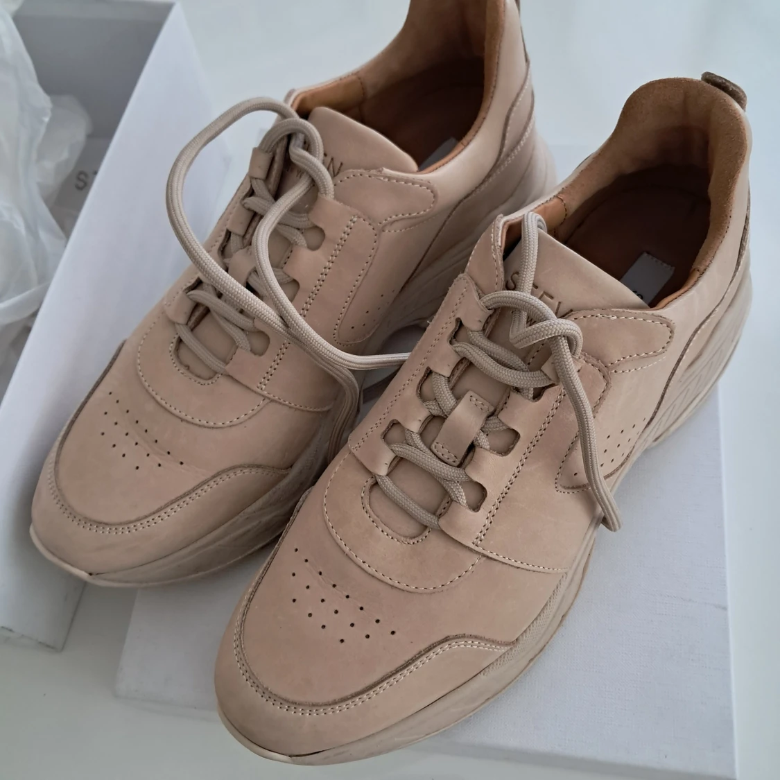 Chunky sneakers i läder med snygga paneler och perforerade detaljer. Skorna har platt sula med transparenta partier i hälen och rund tå. Klassisk snörning och mjuk insida för extra komfort. Perfekt för dig som gillar stilrena och trendiga sneakers. (Använda 1 gång)