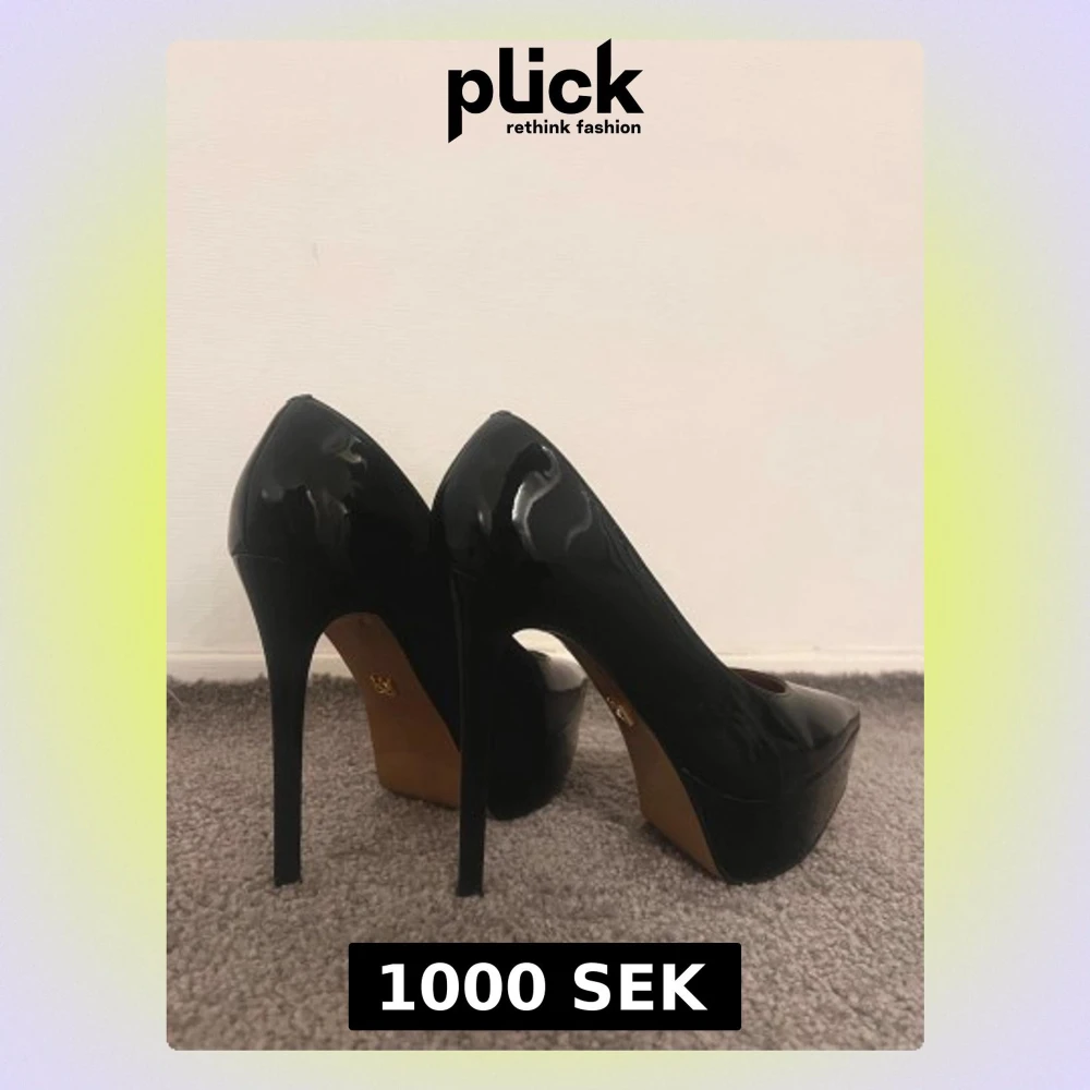 Säljer ett par svarta pumps med riktigt hög klack och platå. Skorna har en spetsig tå och är tillverkade i blankt syntetmaterial som ger en snygg glansig finish. Perfekta för dig som vill sticka ut och få extra höjd.