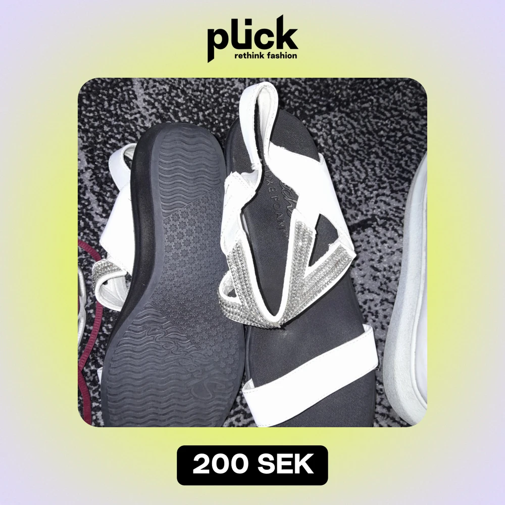 Snygga vita sandaler med en bekväm kilklack och glittriga remmar som ger en extra touch. Perfekta för sommarens alla fester eller en dag på stan. De har en svart sula och är i mycket bra skick. Passar perfekt för dig som vill ha både stil och komfort.